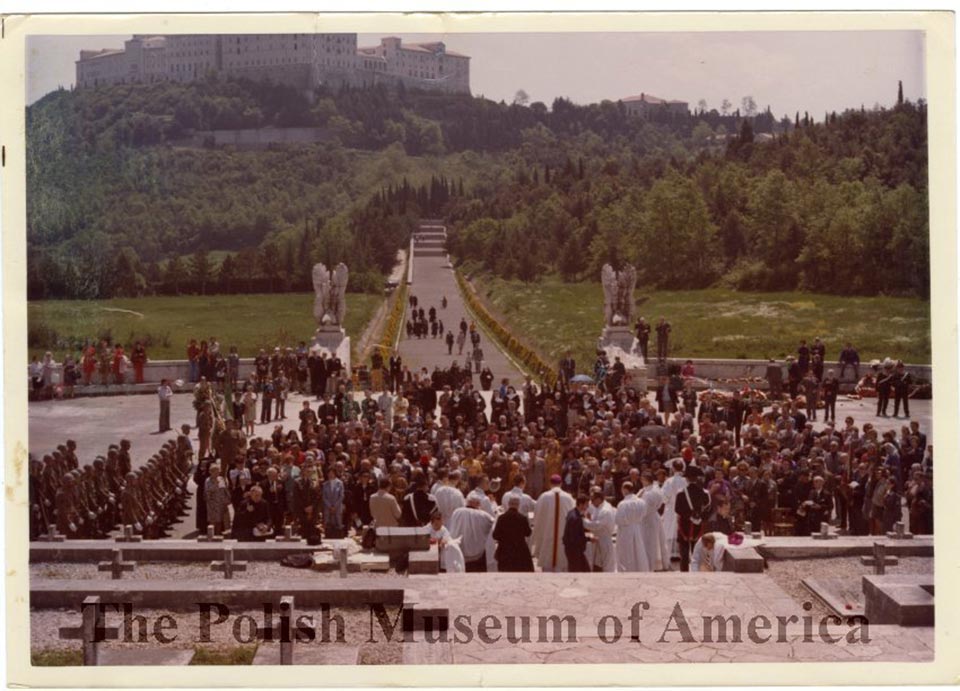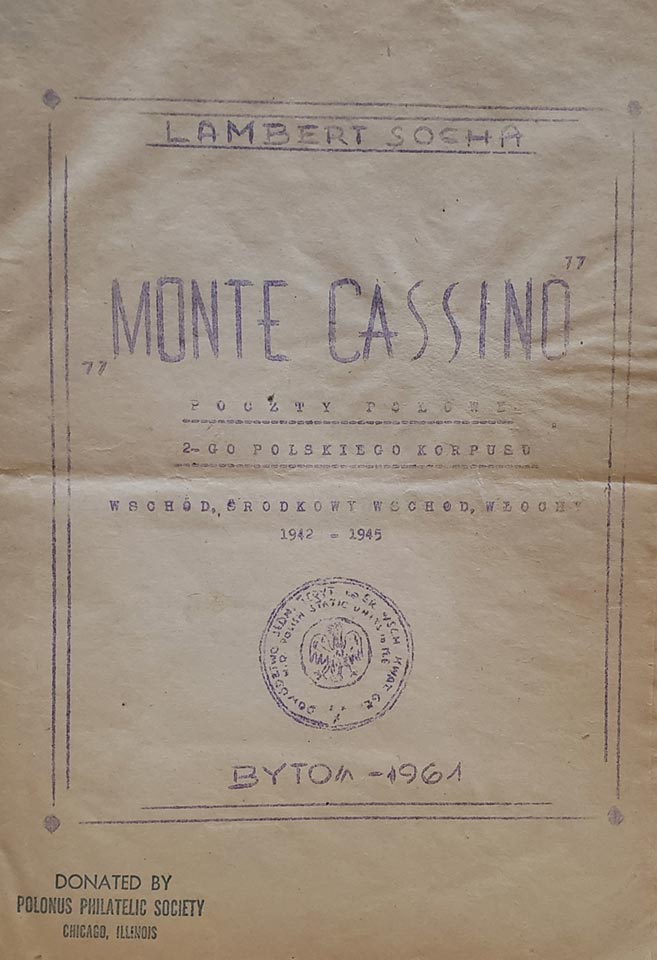 Photos present PMA collection 30th commemoration of Cassino Battle, showing the event participants and veterans(foreground) and Mount Cassino with Benedictine monastery in background-this photo was dedicated in 1974 to Lydia Pucinska; PMA Library collection books "Monte Cassino" about HQ-Polish Station units in the Middle East(pol. Dowodztwo Jednostek Terytorialnych na Srodkowym Wschodzie/Poczty polowe 2 Korpusu) Polish 2 Corps field posts in the Middle East and Italy-1942-45 by Lambert Socha, published in Bytom, 1961(donated by Polonus Society-Chicago) and "Battle for Monte Cassino" by Melchior Wankowicz, (Polish forces carrying ammo to the front lines) published in 1947-Milano.