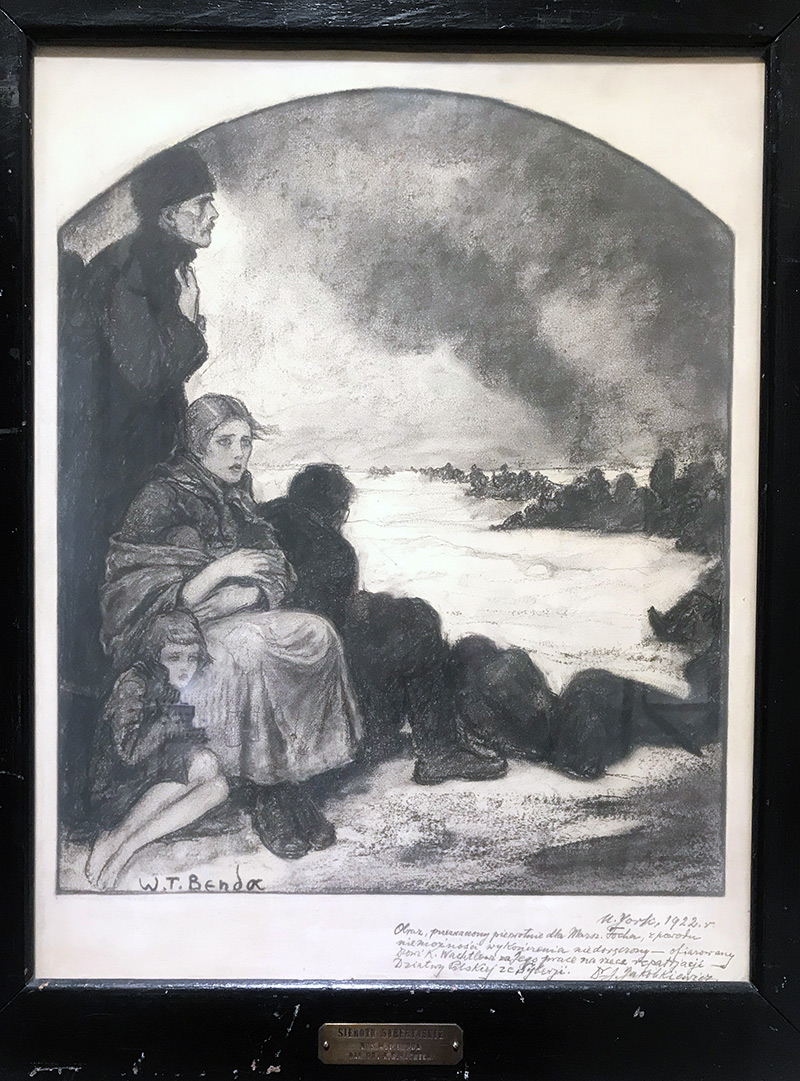 Photos show PMA charcoal on paper “Suffering Poles in Siberia” by W. Benda and PMA Library resources