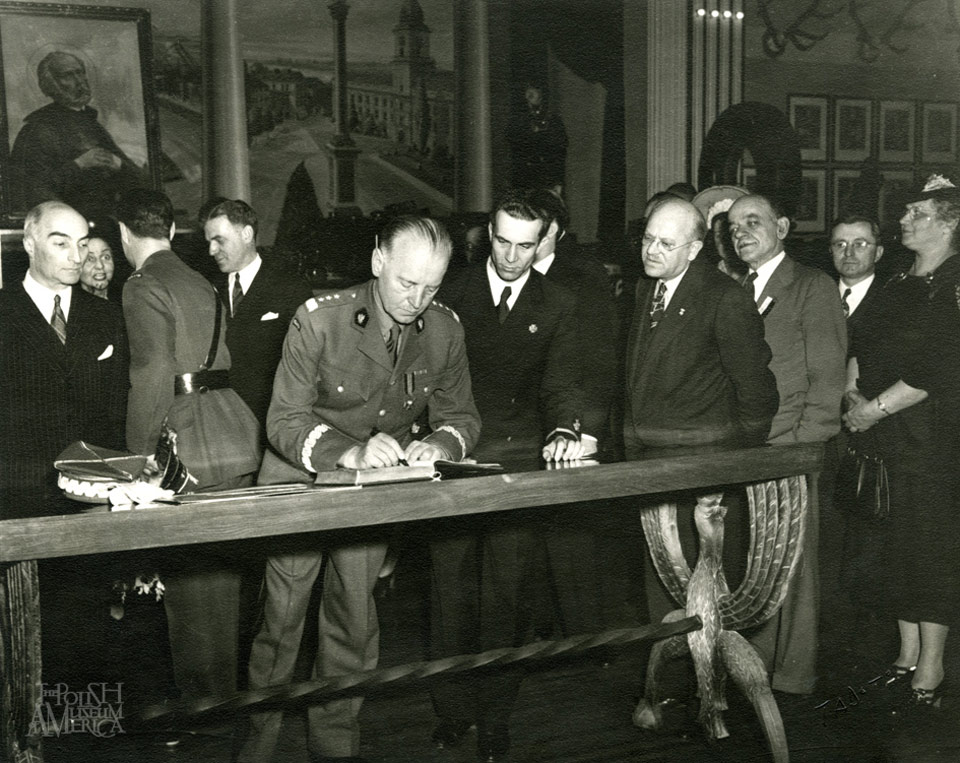 Photo shows PMA Library Polish Consulate gift copy of April Constitution, Polish Labor Minister Jan Stanczyk at Paderewski Room 1941 Opening, Polish PM Gen. Sikorski signing PMA guestbook on oak Polish Eagle carved tables