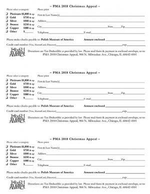 As the independence celebrations continue – the “Polonia Goes to War” exhibit runs until March 10, 2019, we look to our shared past and continue to build a strong future together. We hope that you are able to support the PMA once again with a donation to the 2018 Christmas Appeal. Your contribution to the general operating fund – covering building utilities and improvements, employee payroll and benefits, exhibit development and installation, collection care and management, and so much more, will ensure further success in the New Year.