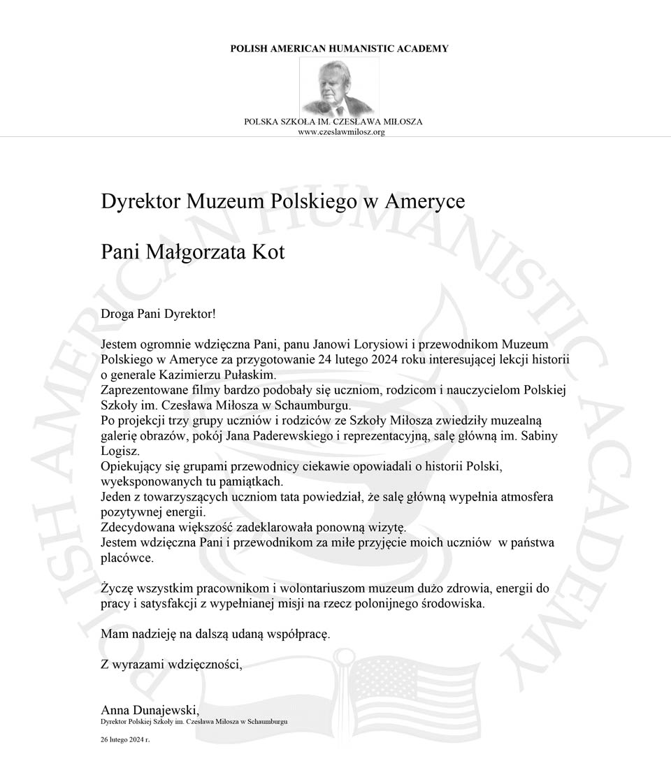 Muzeum Polskie w Ameryce miało przyjemność gościć uczniów Polskiej Szkoły im. Czesława Miłosza w Schaumburgu! Ich misja nauczania języka polskiego, historii i geografii, przy jednoczesnym pielęgnowaniu głębokiego związku z polską kulturą, współgrała z wartościami naszego muzeum.
