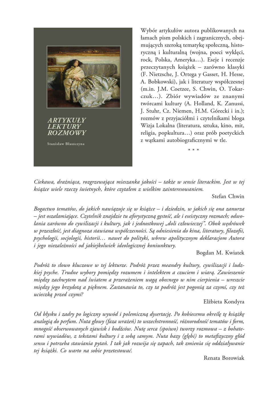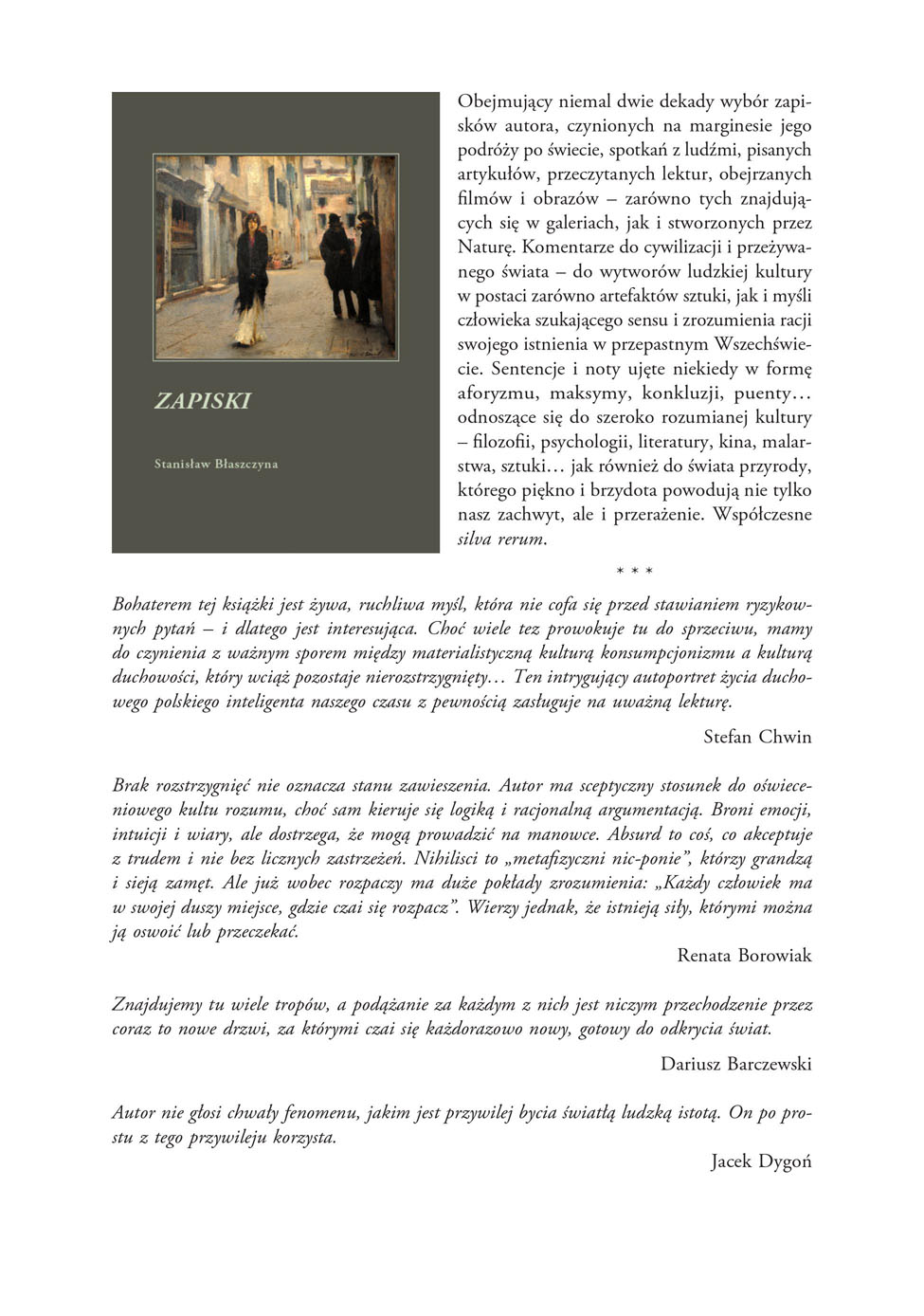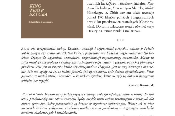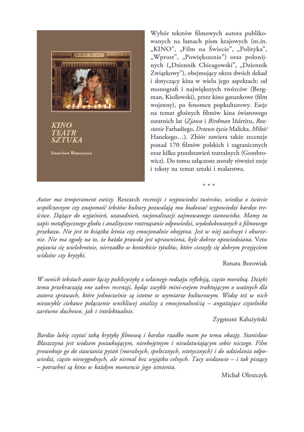 Stanisław Błaszczyna – dziennikarz, fotograf, krytyk filmowy, podróżnik, publicysta. Jego rodzinne miast to Leżajsk; biograficznie i emocjonalnie związany z Krakowem, od 1990 r. mieszka w Stanach Zjednoczonych. Przez wiele lat był jednym z redaktorów „Dziennika Chicagowskiego” oraz tygodnika „Relax”. Następnie publikował regularnie w polonijnym „Dzienniku Związkowym” teksty o tematyce politycznej, społecznej i kulturalnej. Jest również autorem artykułów, które ukazywały się w prasie krajowej, m.in. w tygodnikach „Wprost” i „Polityka”. Przeprowadził wiele wywiadów z wybitnymi ludźmi ze świata polityki i kultury. Jest autorem pierwszej polskiej monografii o Parku Narodowym Yellowstone. Jedną z jego pasji, oprócz podróżowania, jest również film. Współpracował z miesięcznikami „Kino”, „Film na Świecie” i „Powiększenie”.