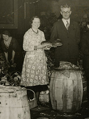 Thanksgiving baskets prepared for the poor, by the PRCUA Women’s Department in the PRCUA Auditorium, now the PMA Sabina P. Logisz Great Hall; 1940s. Collection of the Polish Museum of America, ID x2007.004.0155