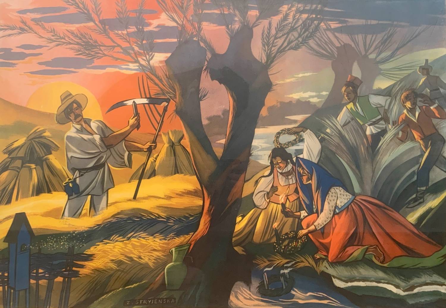 Stryjeńska’s work is characterized by a lively temperament, vibrant palette, and confident draftsmanship, a distinctive painting style evidenced in a creative interpretation of traditional Polish folkloric motifs, specifically those of the Zakopane region, which emphasized line and flat color areas. Her compositions are genre scenes–views of everyday life–incorporating strands of folk customs, legends, and Old-Polish literature.