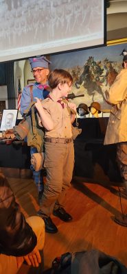 The scouts travelled by public transport from Algonquin, IL for a whole day trip to the museum. They first took part in an immersive living history lesson, presenting the actions of Polish soldiers fighting in the Polish Legions and Polish Army in France during World War I, then they visited the exhibits and worked on their scout program. Guided by hm. Beata Pawlikowska, they looked for signs of the PRCUA Polish scouts from the 1920s, learned about the exploits of Polish scout sailors in the interwar period, and presented historical skits in front of various museum objects that best fit the theme. The boys took a great interest in everything they saw in the museum, asked great questions and studied certain specific objects in depth. Additionally, the scouts met PMA President, hm. Ryszard Owsiany, who introduced them to the museum's history and gave each scout a pin commemorating the PMA's 90th anniversary. Finally, one of the scouts announced that artist, Andrzej Filipowicz, whose paintings of Bl. Wincenty Stefan Frelichowski, patron of Polish scouts, and I.J. Paderewski are in the museum, is his uncle, and so "visiting" those paintings became an extra treat.