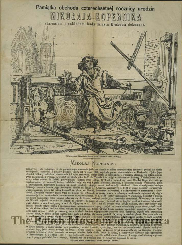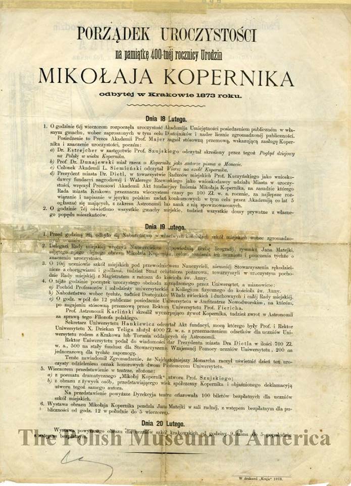 Join us in commemorating this brilliant mind and exploring our rich collection, featuring items such as the inaugural announcement from the Jagiellonian University in Cracow dating back to 1873. This announcement unveiled a program commemorating the 400th anniversary of Copernicus's birth, showcasing the lasting influence of his remarkable contributions.