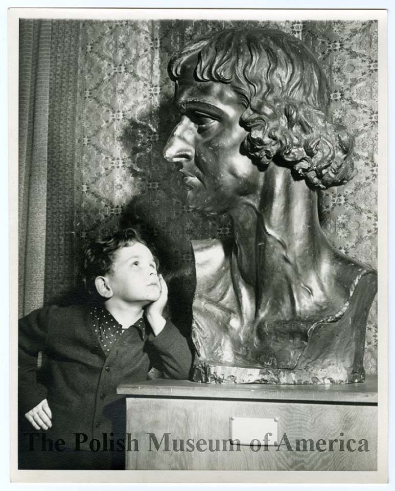 Dodatkowo prezentujemy Państwu fotografię czteroletniego Michała Sworakowskiego pozującego przy rzeźbie Stanisława Szukalskiego zatytułowanej „Autoportret jako Kopernik”. Ten wyjątkowy portret odzwierciedla głęboki związek Szukalskiego z Kopernikiem, gdyż astronom często pojawiał się w jego twórczości. Z kolei fotografia przedstawiająca chłopca i rzeźbę ukazała się w „Dzienniku Zwiazkowym” 3 czerwca 1944 r.