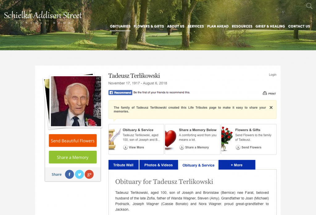 Rankiem w dniu dzisiejszym, 6 sierpnia 2018 roku, w wieku 100 lat zmarł kapitan Tadeusz Terlikowski. Urodzony 17 listopada 1917 roku, syn Józefa i Bronisławy z domu Farat, mąż śp. Zofii, ukochany ojciec, dziadek i pradziadek.
