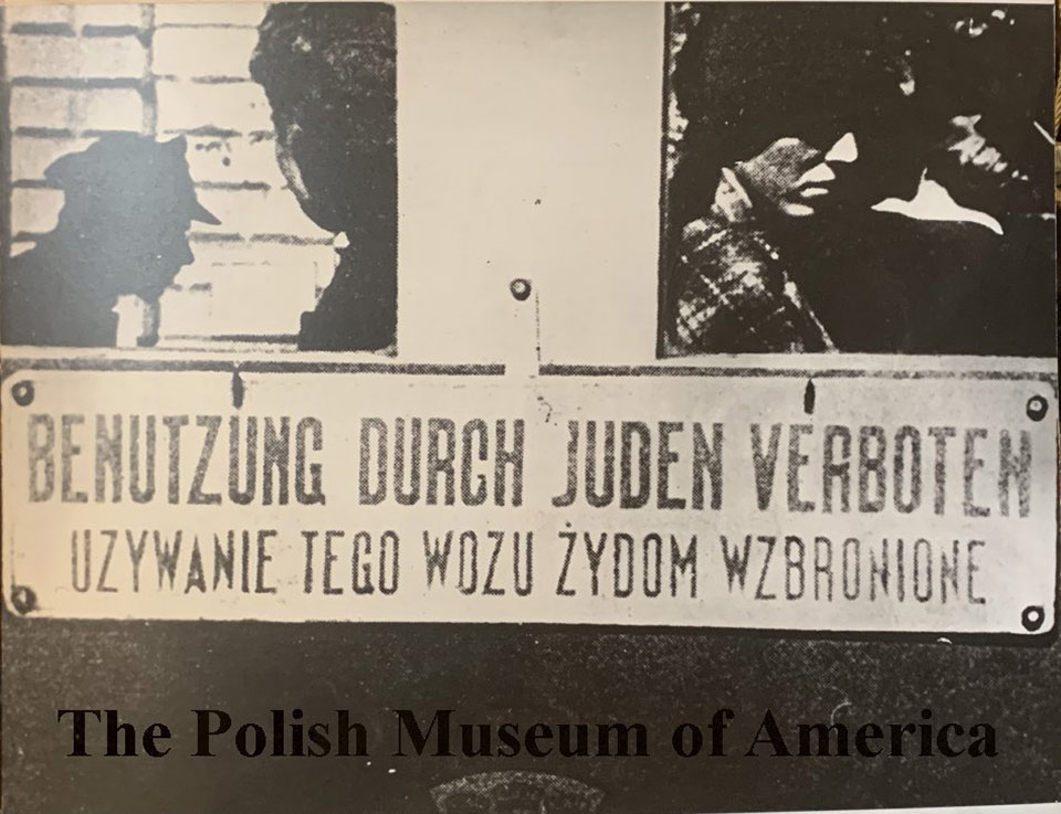 - Fotografia dwujęzycznego znaku na samochodzie, na którym widnieje mrożący krew w żyłach napis: „Używanie tego wozu Żydom zabronione”.