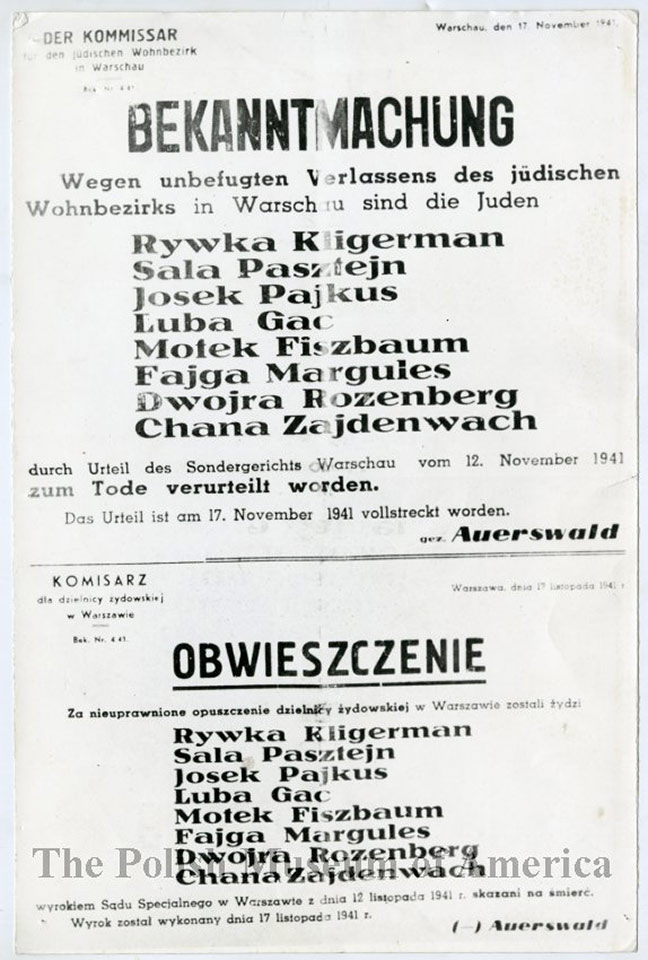 - Dokument „Obwieszczenie/Bekanntmachung” w języku niemieckim i polskim, zawierający nazwiska 8 Żydów zamordowanych za opuszczenie getta 17 listopada 1941 r.