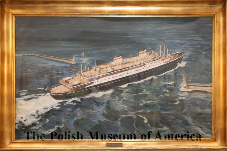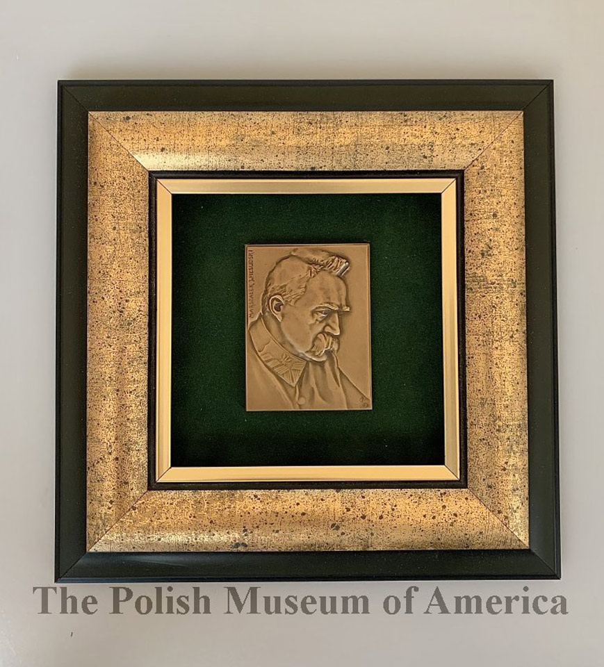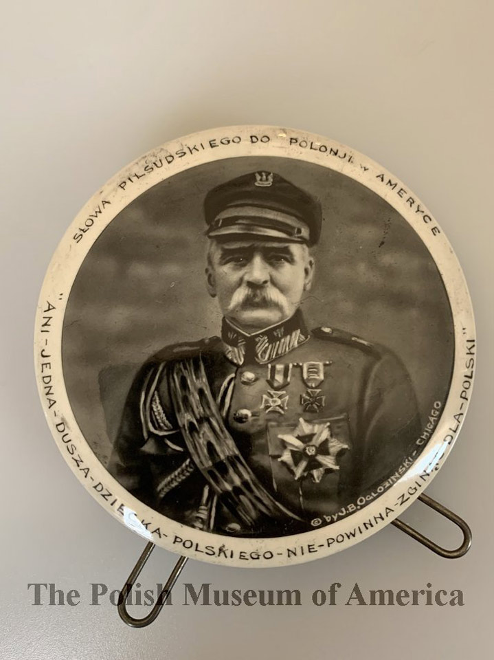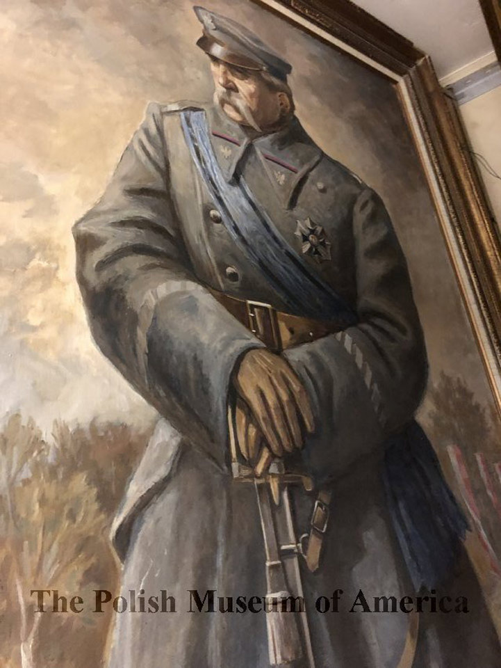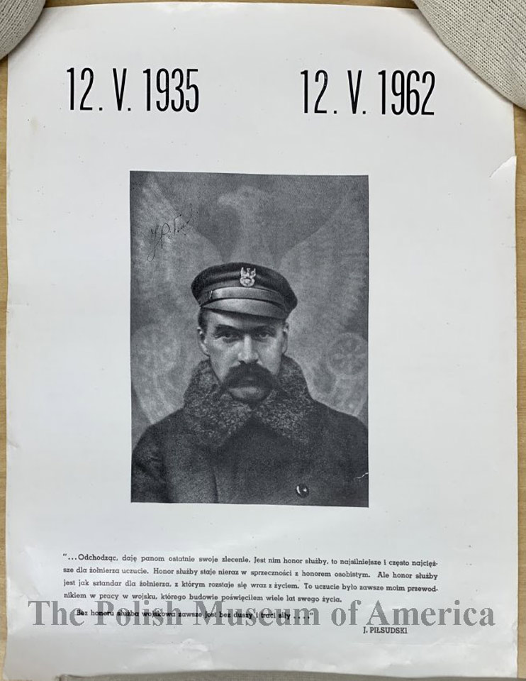 Photos show our PMA Collection Wladyslaw Gawron's oil painting of JP; 27 PNA Convention Pin reading "Not one Polish child's soul should perish"; bronze medal with Pilsudski profile in the gold frame; bronze memorial plaque-1st Marshall of Poland-nation's leader who gave Poland freedom, borders, power, and respect;1962 poster; M/s Pilsudski ship poster; M/s Pilsudski departing Gdynia painting by Michalina Krzyzanowska-1930's.
