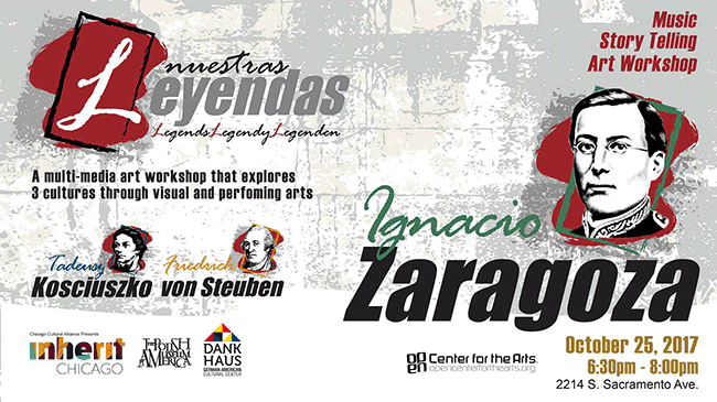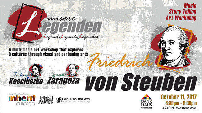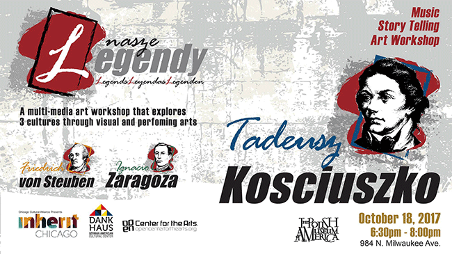 Ignacio Zaragoza. Friedrich von Steuben. Tadeusz Kosciuszko. Their names sound very different, but there is something these three men have in common: they have all become legends. In this multi-media workshop, in collaboration with the DANK Haus German American Cultural Center, the Polish Museum of America and OPEN Center for the Arts, explore what happens when three legendary figures from three different cultures come to life and understand the way they are remembered today. Visual artists will capture the essence of each legend and transform it into a unique, artistic expression, then invite the audience to create their own art. This will be the foundation for a lively dialogue and shared exploration of issues such as cultural heritage, the relation of truth to fantasy, and a community’s need for legends.