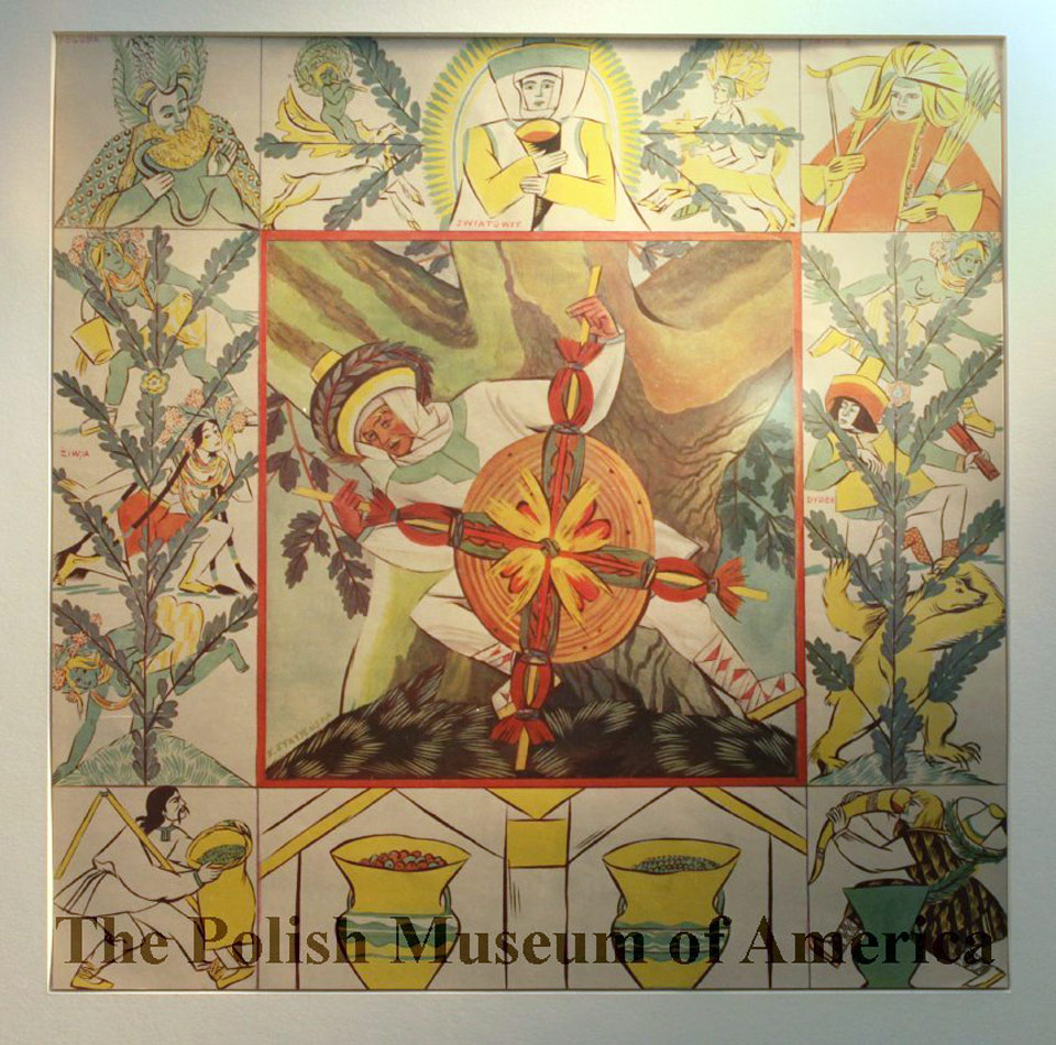 Photos display delightful 1930's Zofia Stryjenska print series extremely rich in theme: Gusla Slowian (Slavic Sorcery) series front cover, Sobotka, Oczepiny, a painting of Ziemowit; Polish peasant costume collection Kaszuby, Silesia; The Resurrection, 1950, tempera. And Vortex-tapestry by Zofia Butrymowicz, 1986.