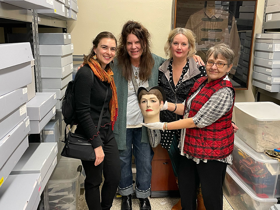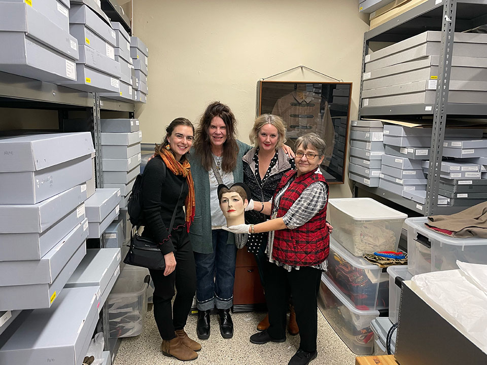 Visitors from Chicago Dramatists Klaudia Siczek, Carson Becker, and Ruth Margraff looking at the PMA Helena Modjeska collection with Basia Kożuchowska. They are interested in a potential theatrical collaboration based on the Polish-American Shakespearean actress.