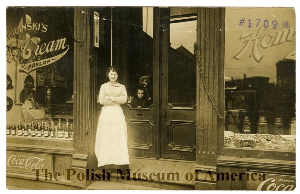 Pictured here is "Bess" Pelagia Kilinska standing in front of Kilinski's Ice Cream Parlor at the corner of Thomas and Milwaukee. The little girls in the window are Janina and Irma Ulatowska, nieces of Ignacy Ulatowski (owner of theaters and an actor from Hamtramck).