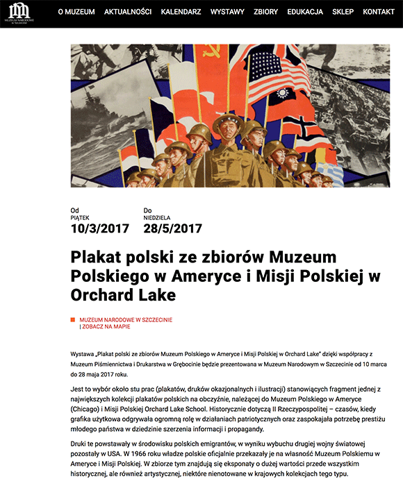 Wystawa „Plakat polski ze zbiorów Muzeum Polskiego w Ameryce i Misji Polskiej w Orchard Lake” dzięki współpracy z Muzeum Piśmiennictwa i Drukarstwa w Grębocinie będzie prezentowana w Muzeum Narodowym w Szczecinie od 10 marca do 28 maja 2017 roku.