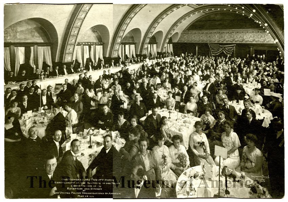 PMA Collection photo shows United Polish Organizations of America reception/dinner celebrating the Constitution's 125 anniv. on May 28,1916. And PMA artefact-medal marking Constitution's 100 anniv.-New York 1891.