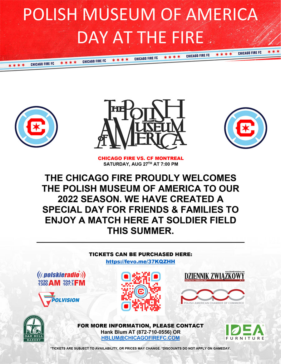 Join us on Saturday, August 27th at 7PM for a Chicago Fire match at Soldier Field. This event is a fundraiser for the Polish Museum of America and a portion of the ticket price will be donated to the PMA.