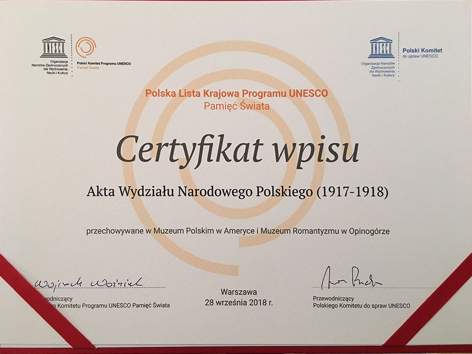 Akta Wydziału Narodowego Polskiego z kolekcji Muzeum Polskiego w Ameryce wpisane na Listę Krajową Programu UNESCO „Pamięć Świata”