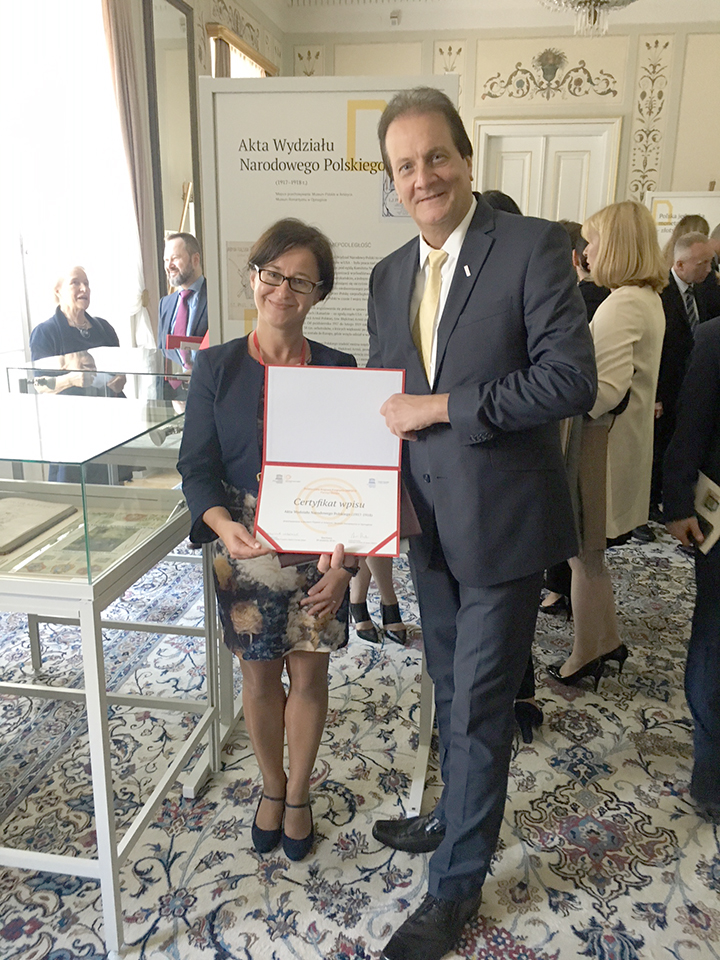 September 28, 2018, Warsaw, Poland – The Polish Museum of America (PMA) was recognized today at the Belweder Palace in Warsaw, during this anniversary year marking 100 years of Poland’s regained independence. Selected documents from the Polish National Department (PND) collection held in the PMA Archives were entered into the United Nations Educational, Scientific and Cultural Organization (UNESCO) Memory of the World Register for 2018.