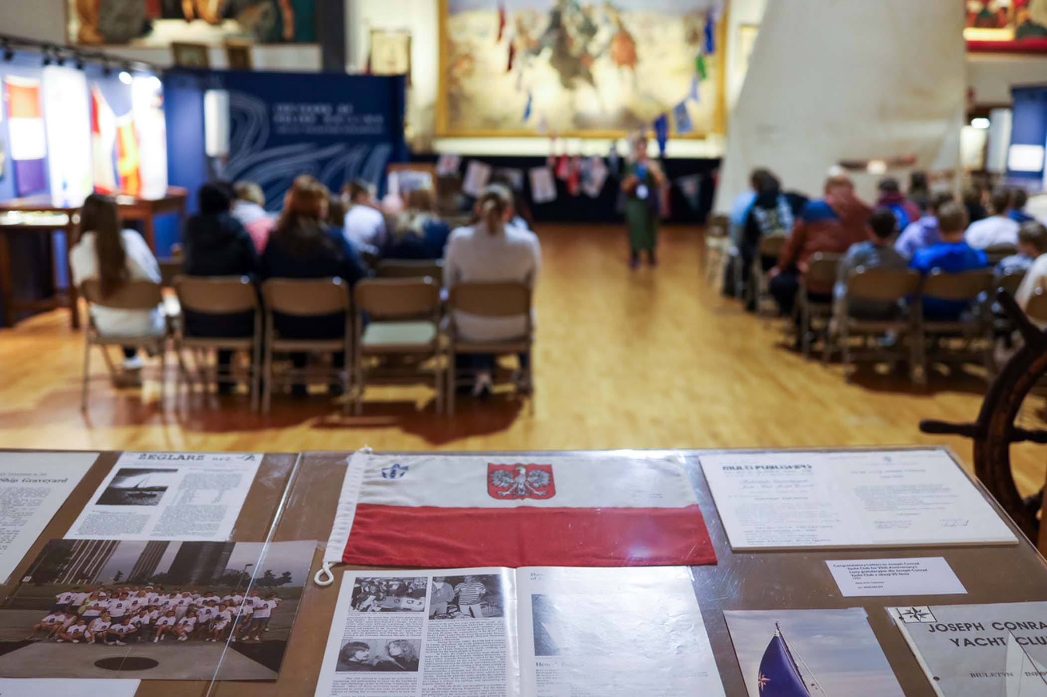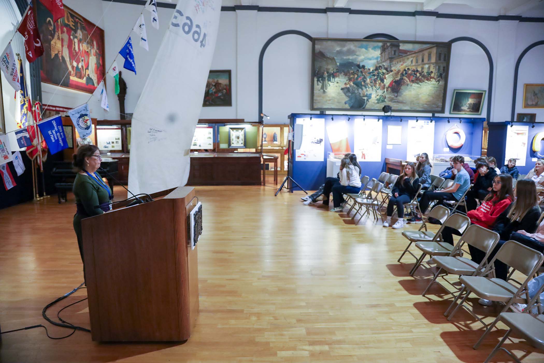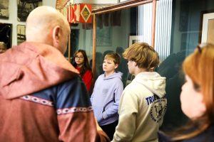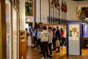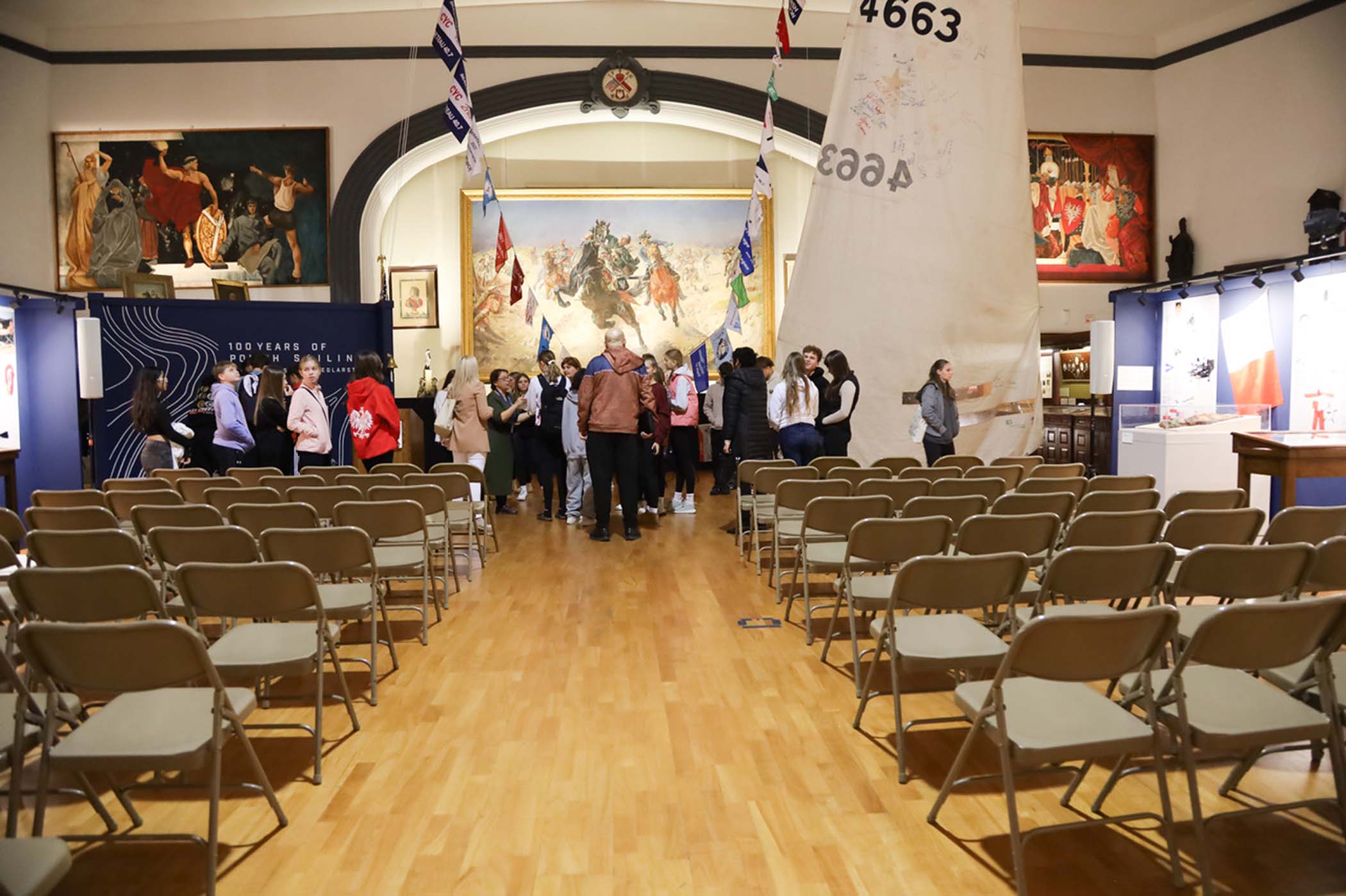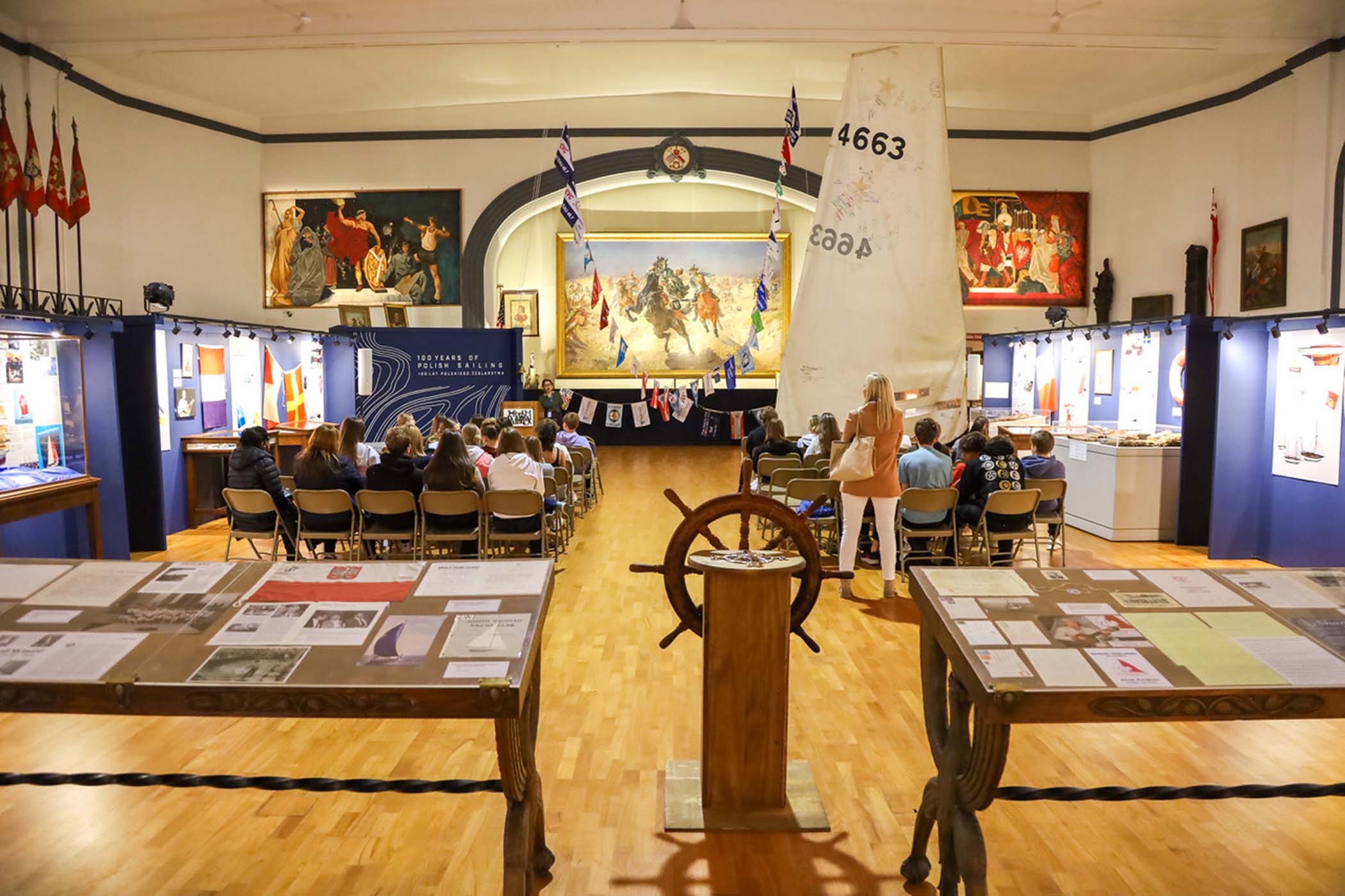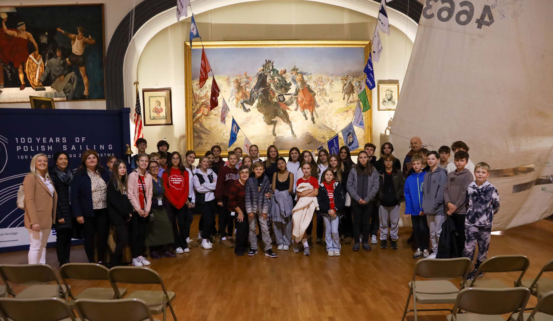 Students from the 6th grade through the third year of high school from the Jan Kochanowski Polish School in Norridge, IL, visited the Polish Museum of America on Saturday, November 2, 2024. The younger students, visiting the museum for the first time, were led through all the exhibits by Barbara Kożuchowska, who not only brought the exhibits to life but also engaged the students in lively discussion. The older students, who were visiting for the third time, were encouraged to delve into a single curated theme while visiting several of the galleries. This year they investigated Poland’s relationship with the sea in the interwar period. The students discussed several objects in depth and offered many insightful observations. The tour concluded with a group photograph in front of the full sail and pennants on display as part of the 100 Years of Polish Sailing exhibition.