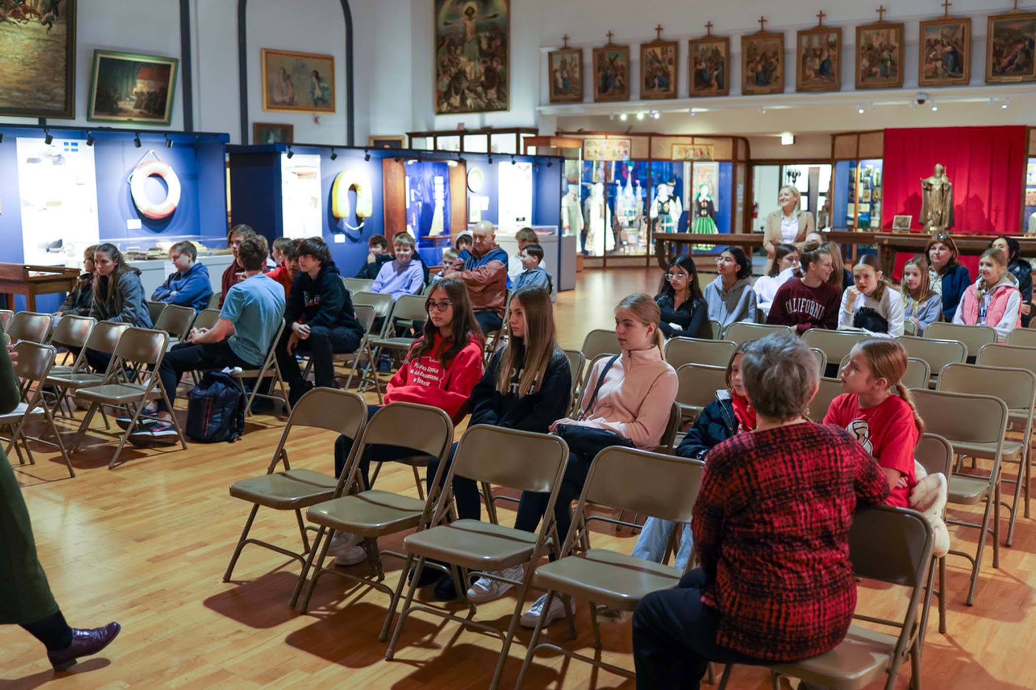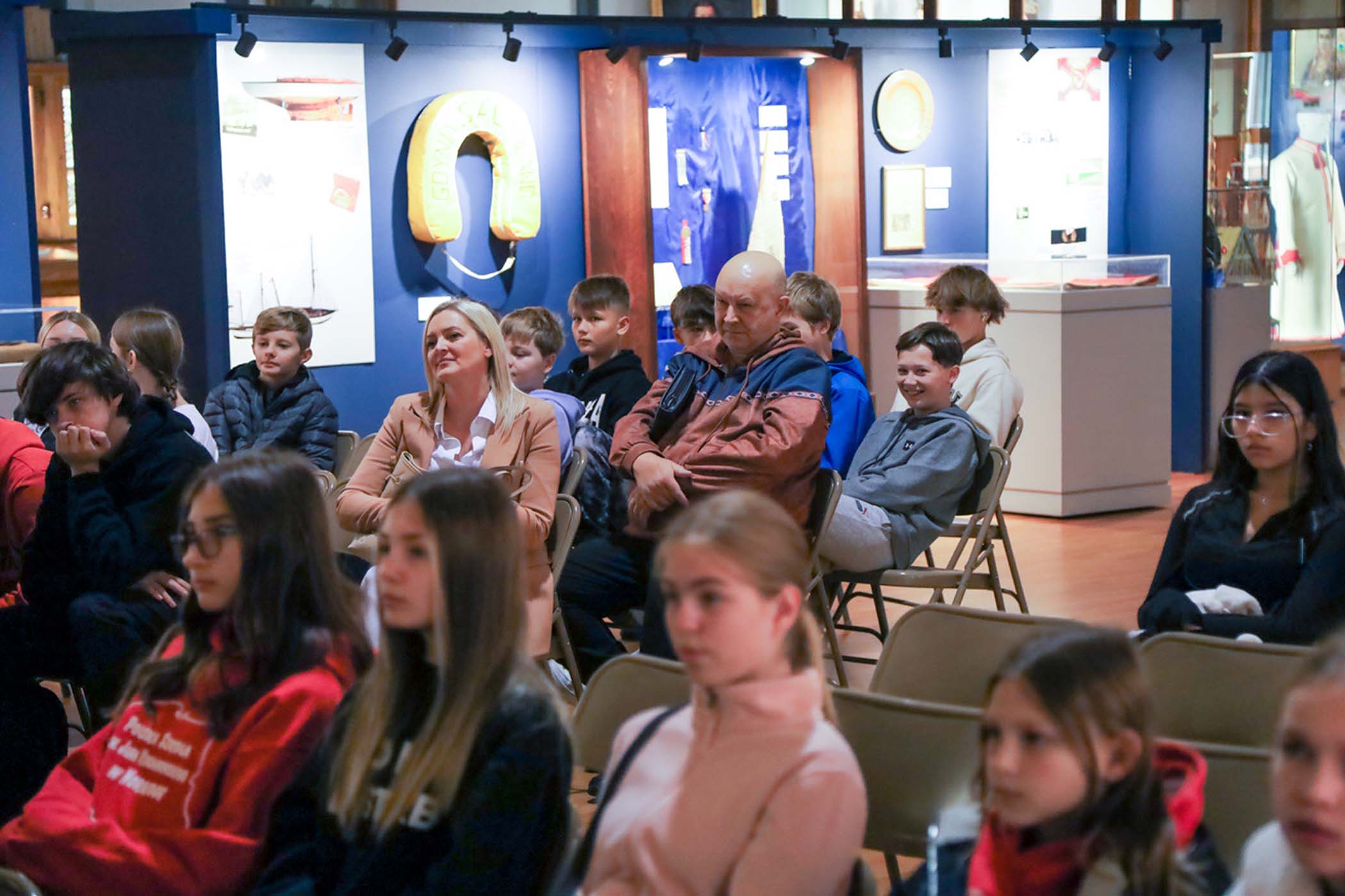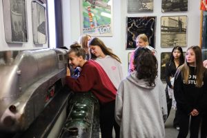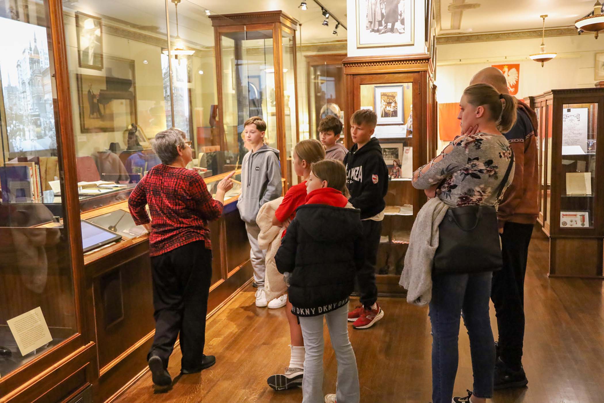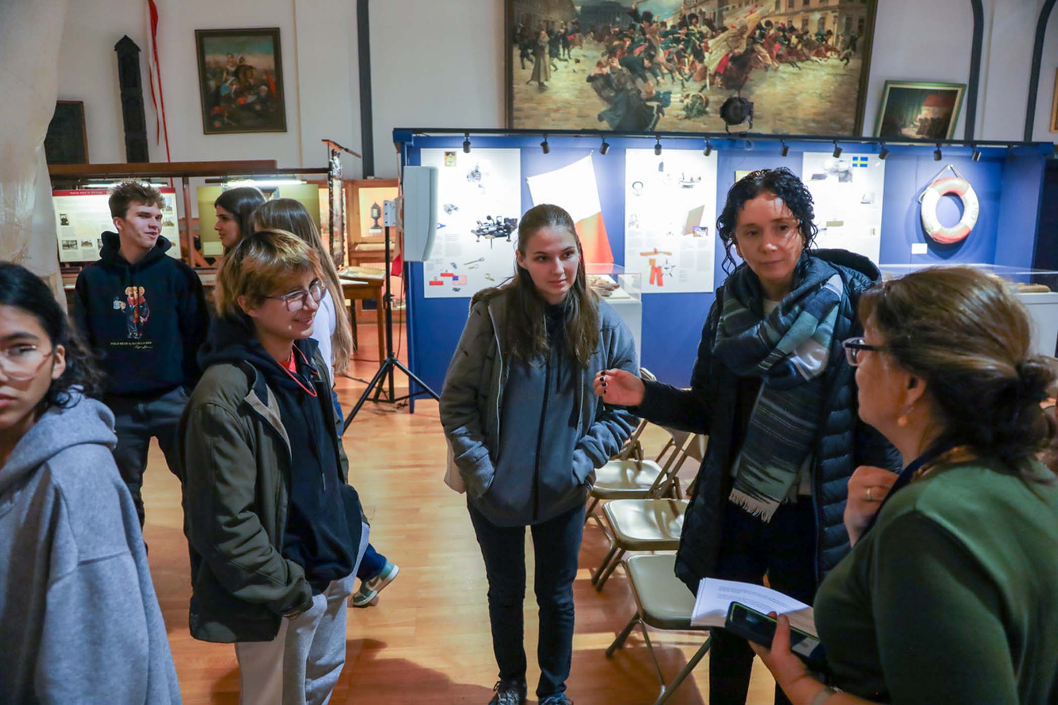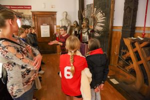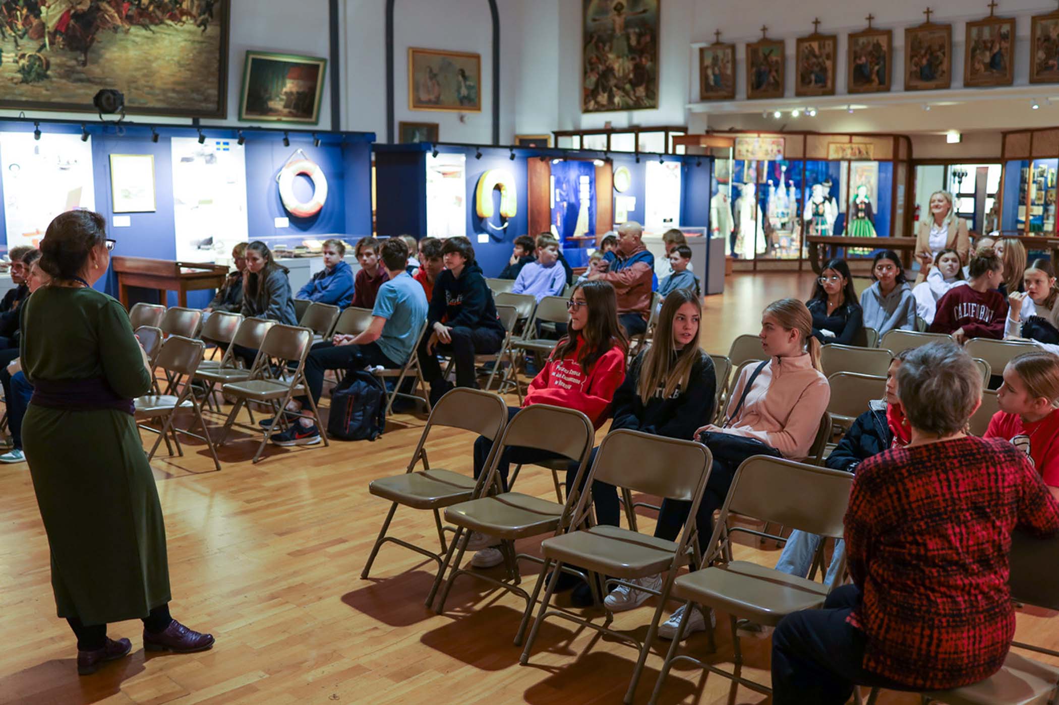 Students from the 6th grade through the third year of high school from the Jan Kochanowski Polish School in Norridge, IL, visited the Polish Museum of America on Saturday, November 2, 2024. The younger students, visiting the museum for the first time, were led through all the exhibits by Barbara Kożuchowska, who not only brought the exhibits to life but also engaged the students in lively discussion. The older students, who were visiting for the third time, were encouraged to delve into a single curated theme while visiting several of the galleries. This year they investigated Poland’s relationship with the sea in the interwar period. The students discussed several objects in depth and offered many insightful observations. The tour concluded with a group photograph in front of the full sail and pennants on display as part of the 100 Years of Polish Sailing exhibition.