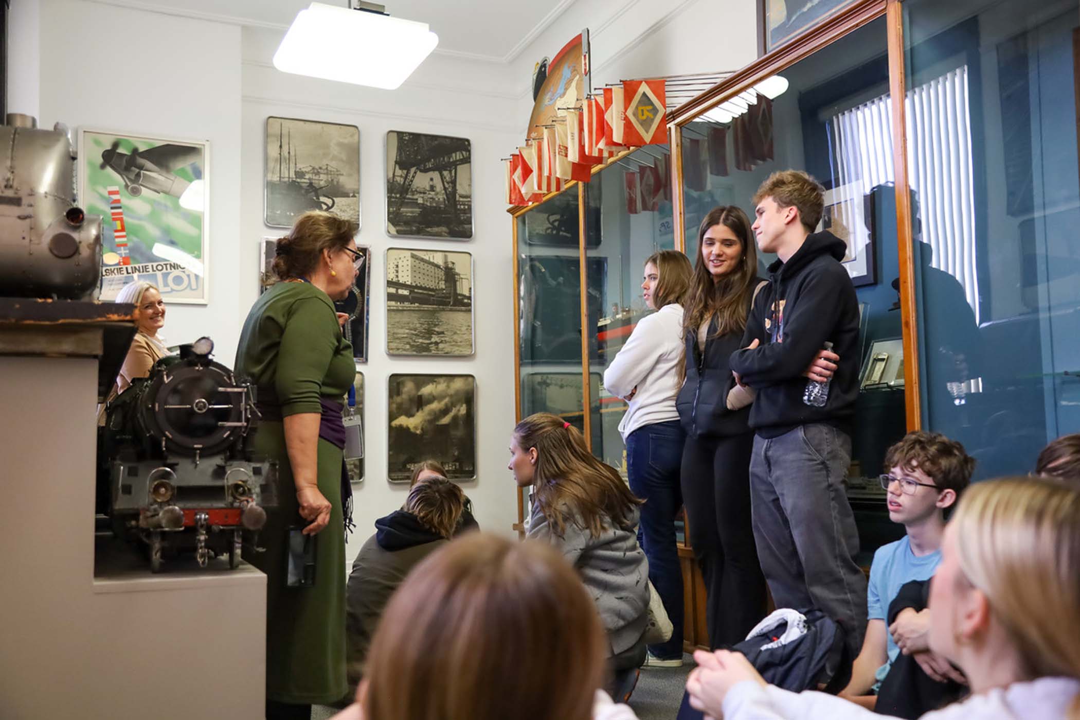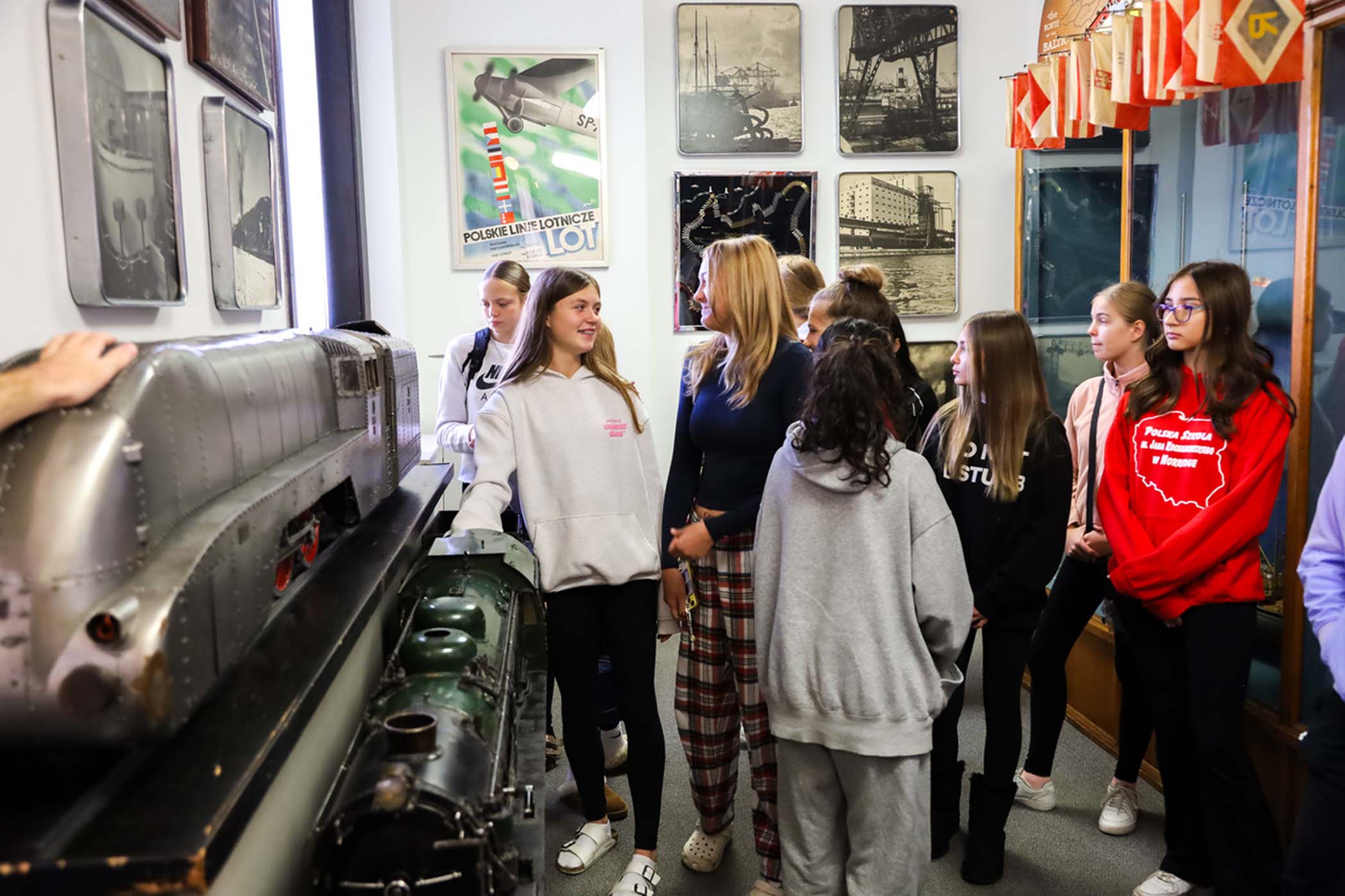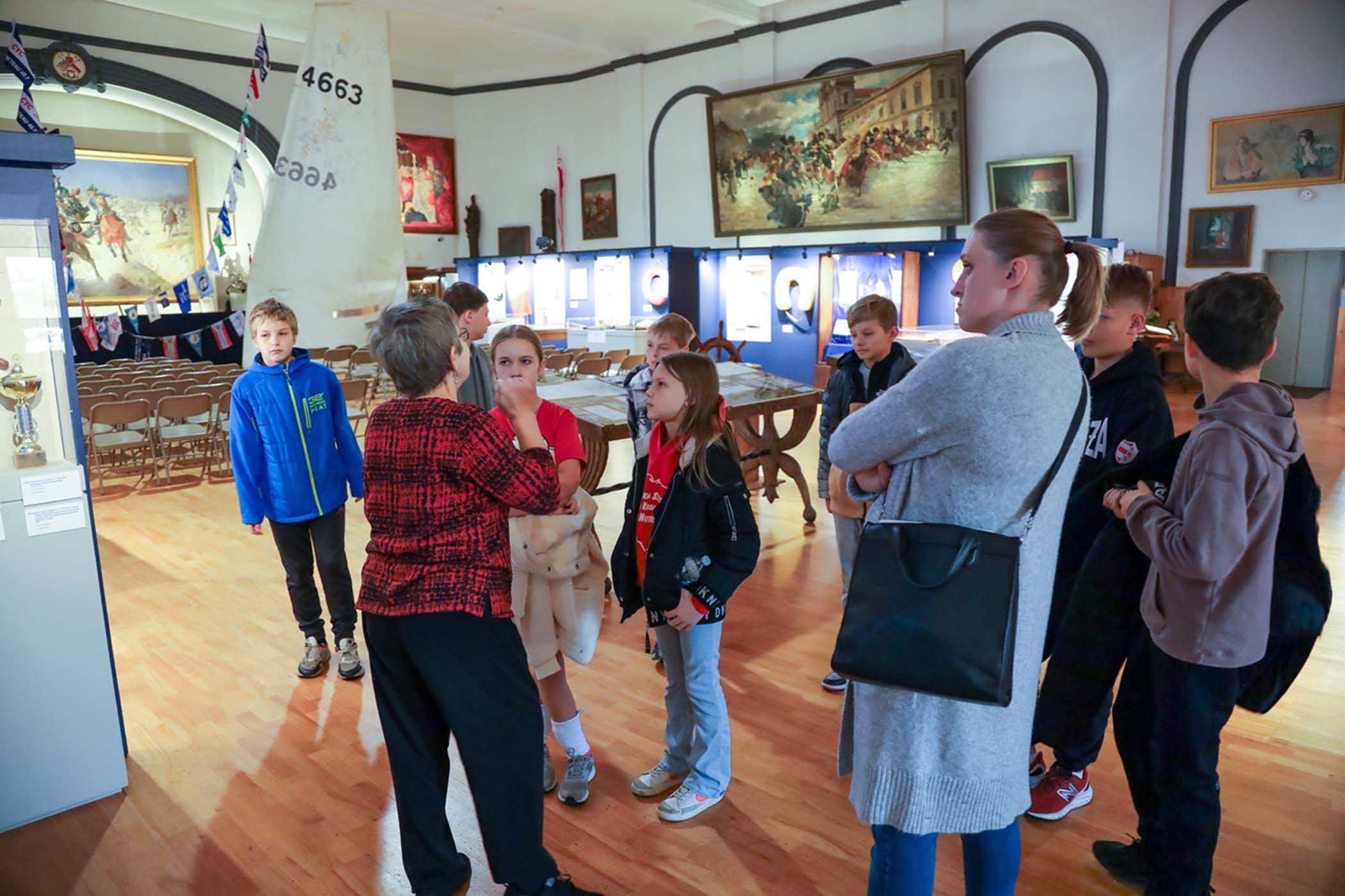 Uczniów młodszych klas, którzy przyjechali do Muzeum po raz pierwszy, oprowadzała p. Barbara Kożuchowska. Nie tylko w obrazowy sposób tłumaczyła im o powstawaniu i o zbiorach Muzeum, ale zachęcała do żywej rozmowy. Uczniowie starszych klas, dla których to już była trzecia wizyta, byli zachęceni do zagłębienia się w jeden temat, który powtarza się w różnych salach wystawowych. Tym razem tematem był stosunek Polski do morza w okresie międzywojennym. Uczniowie nie tylko zadawali ciekawe pytania, ale także dzielili się wnikliwymi spostrzeżeniami. Wycieczka została zakończona wspólnym zdjęciem grupy na tle żagla i chorągiewek w Sali Głównej Muzeum.