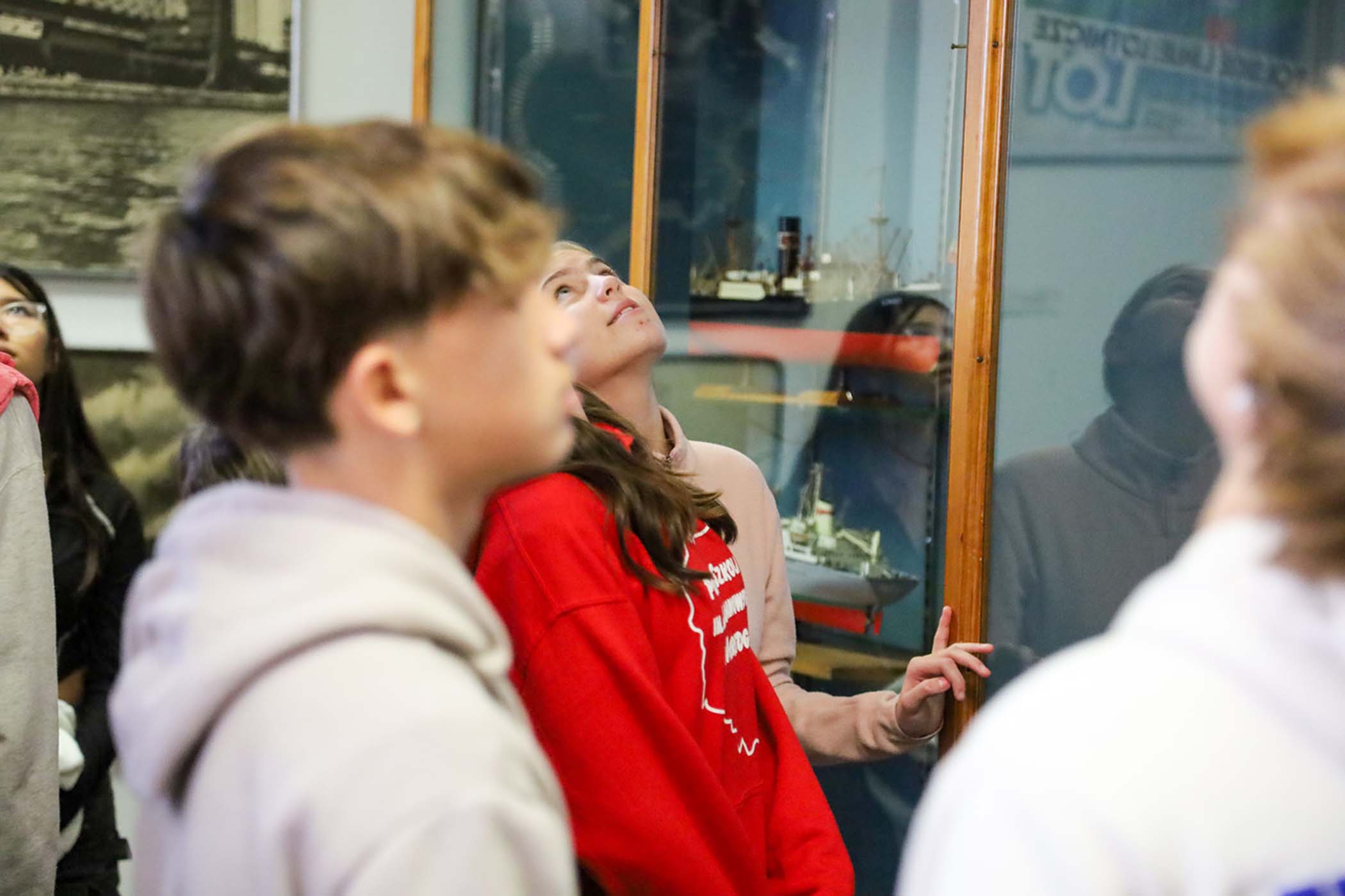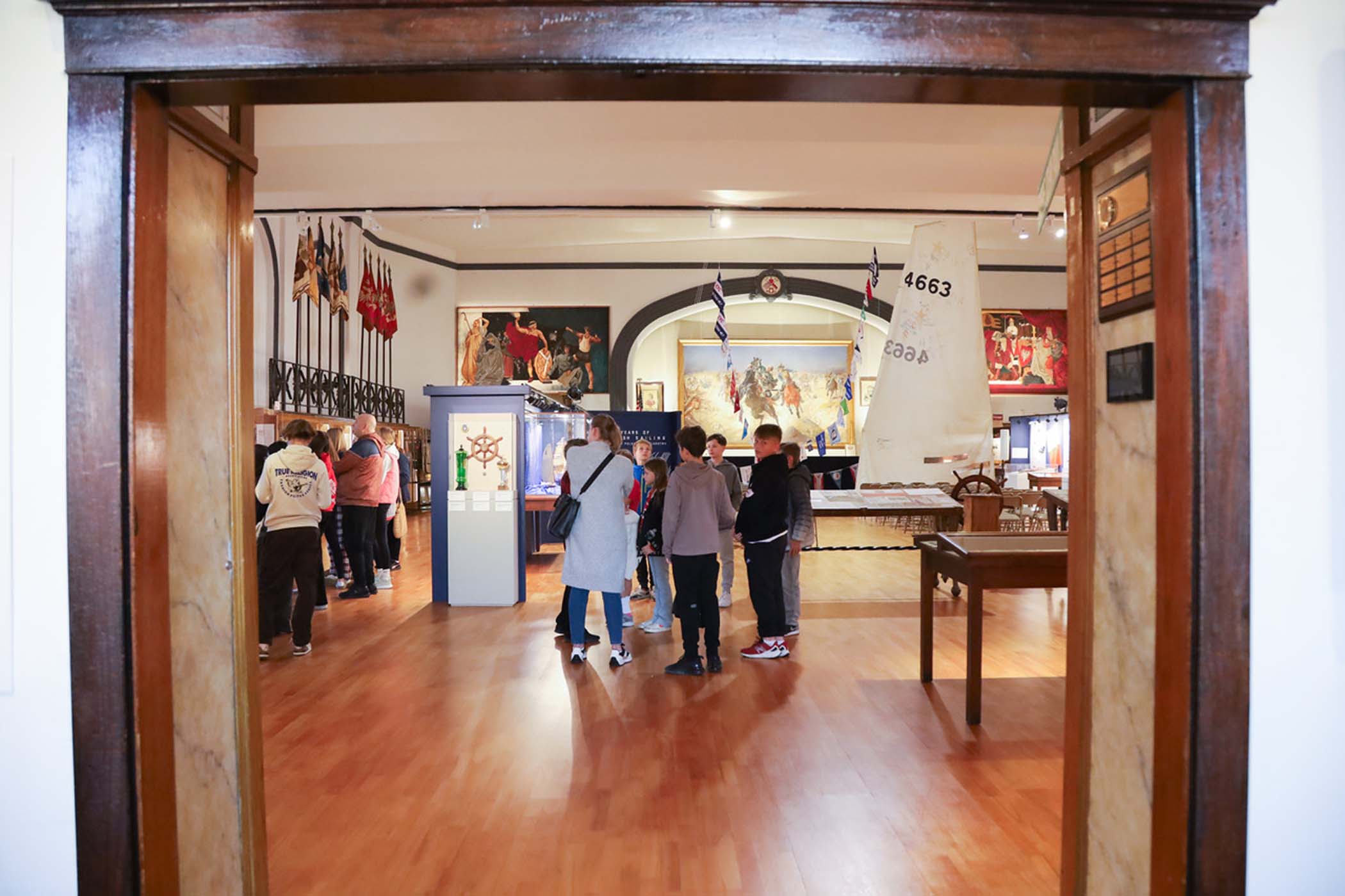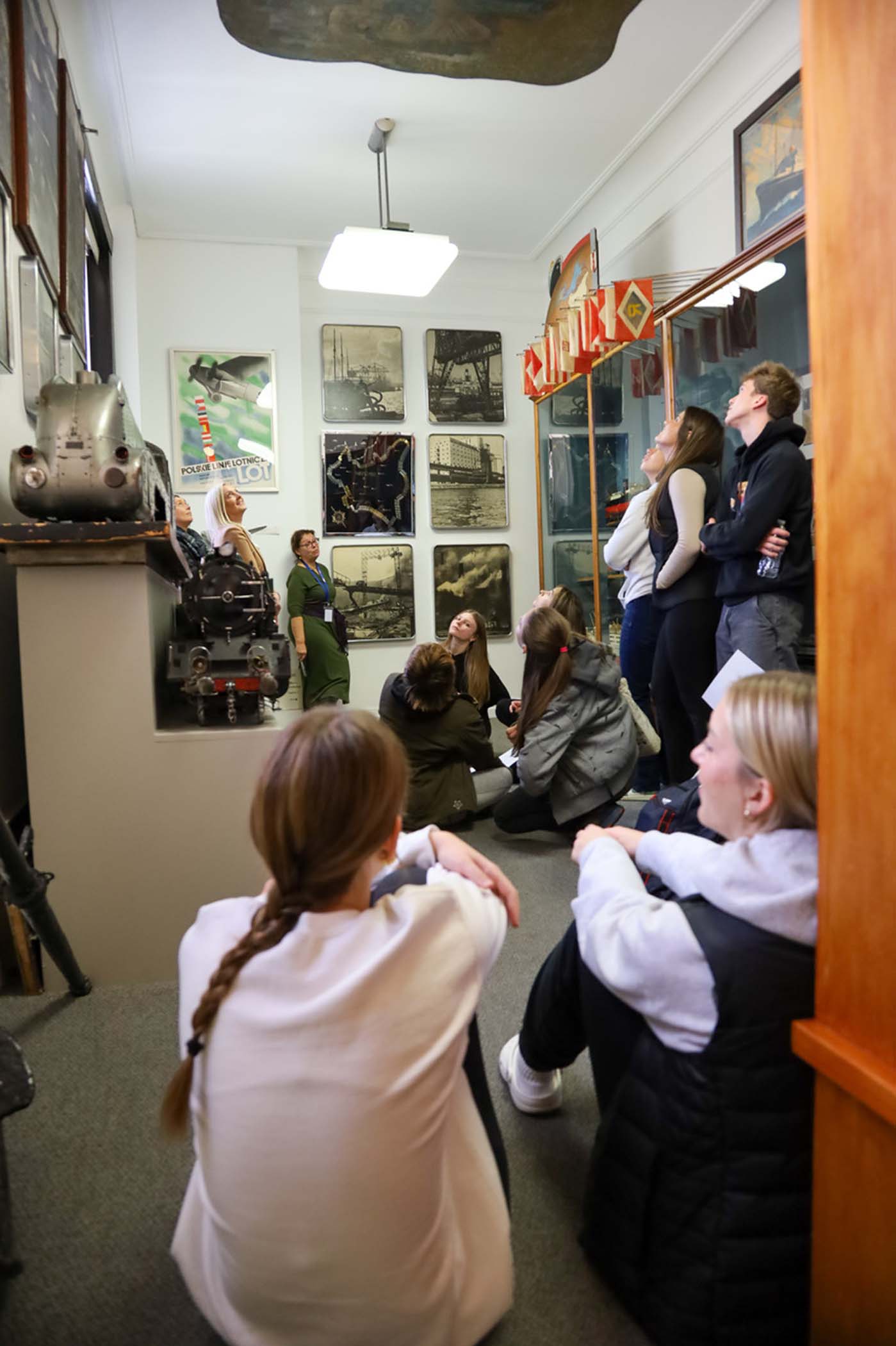 Uczniów młodszych klas, którzy przyjechali do Muzeum po raz pierwszy, oprowadzała p. Barbara Kożuchowska. Nie tylko w obrazowy sposób tłumaczyła im o powstawaniu i o zbiorach Muzeum, ale zachęcała do żywej rozmowy. Uczniowie starszych klas, dla których to już była trzecia wizyta, byli zachęceni do zagłębienia się w jeden temat, który powtarza się w różnych salach wystawowych. Tym razem tematem był stosunek Polski do morza w okresie międzywojennym. Uczniowie nie tylko zadawali ciekawe pytania, ale także dzielili się wnikliwymi spostrzeżeniami. Wycieczka została zakończona wspólnym zdjęciem grupy na tle żagla i chorągiewek w Sali Głównej Muzeum.