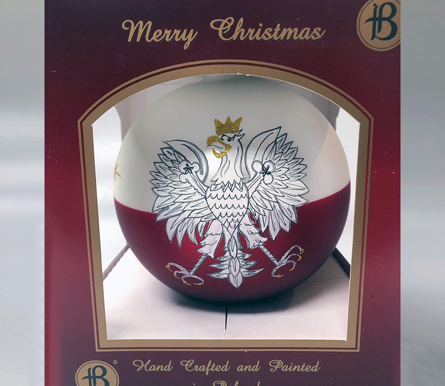 Bring home a bit of Polish tradition with this beautiful handmade glass ornament; perfect as a Christmas present for your loved one, or even to hang on your own Christmas tree. Depicted on the ornament is the Polish eagle on the Polish flag (white and red background).