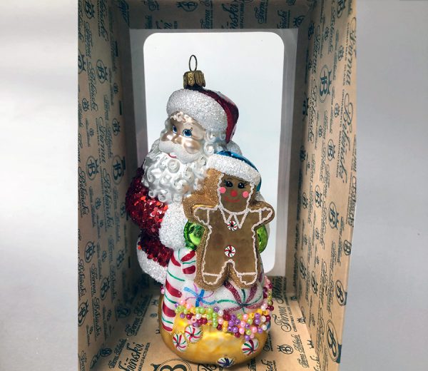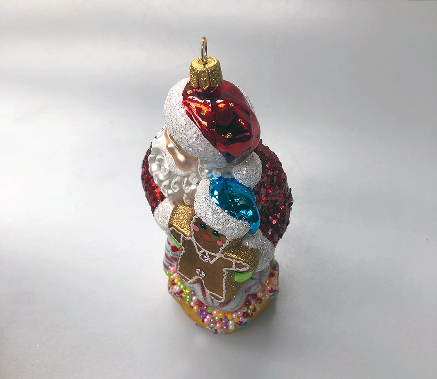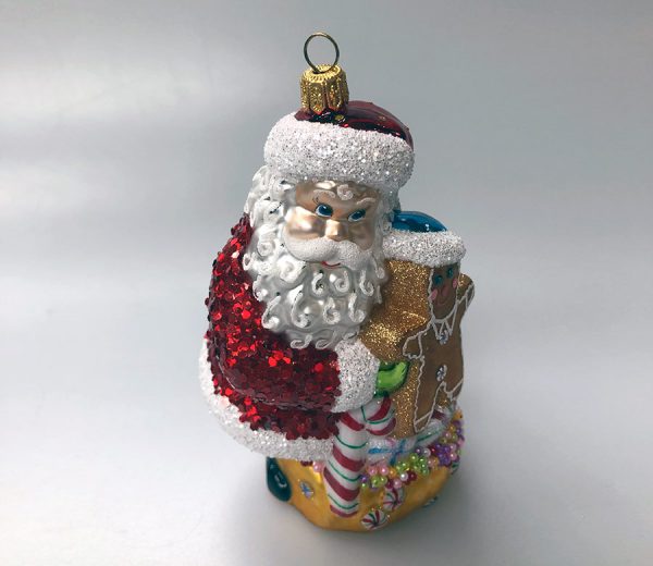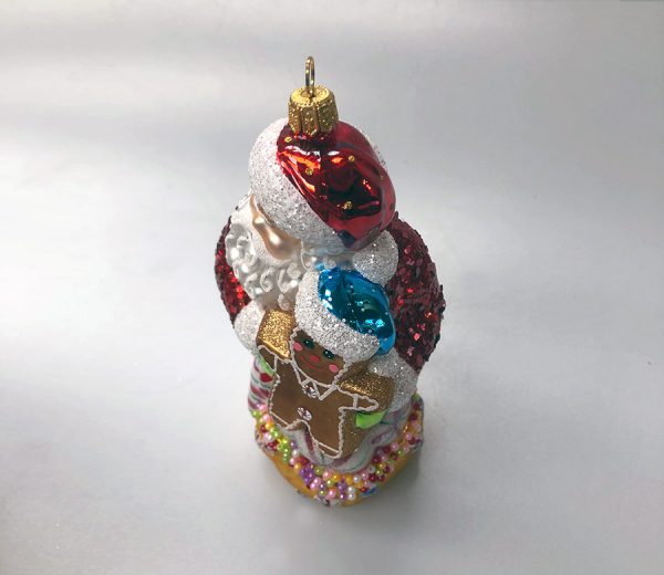 This beautiful handmade glass ornament is perfect as a Christmas present for your loved one, or even to hang on your own Christmas tree. The ornament depicts Santa holding a large gingerbread cookie, surrounded by various candies.