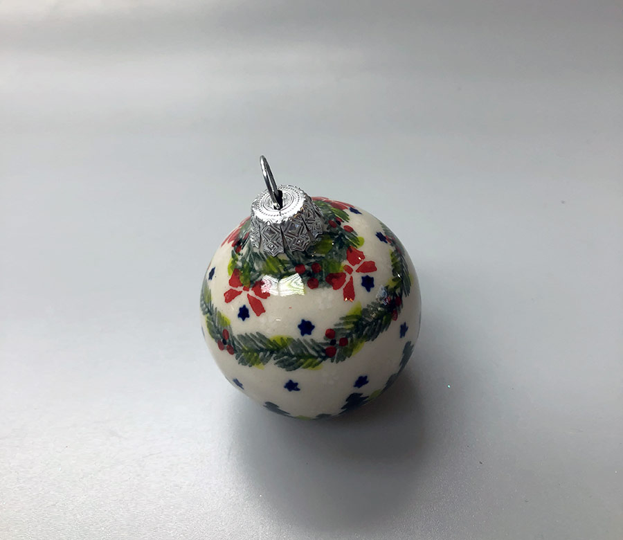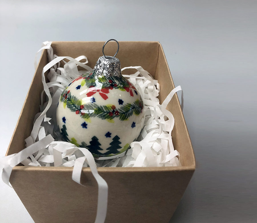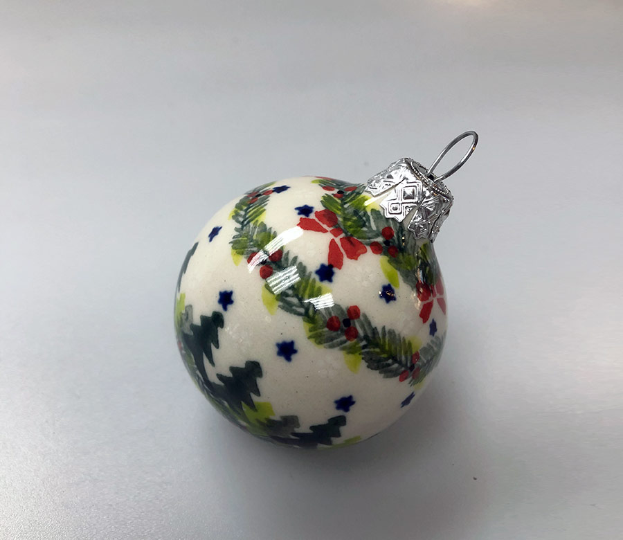 A lovely handmade ceramic Christmas tree ornament with a pattern of bows, pines, stars, and pine trees. This is a wonderful Christmas gift idea for anyone and will look stunning on any Christmas tree.