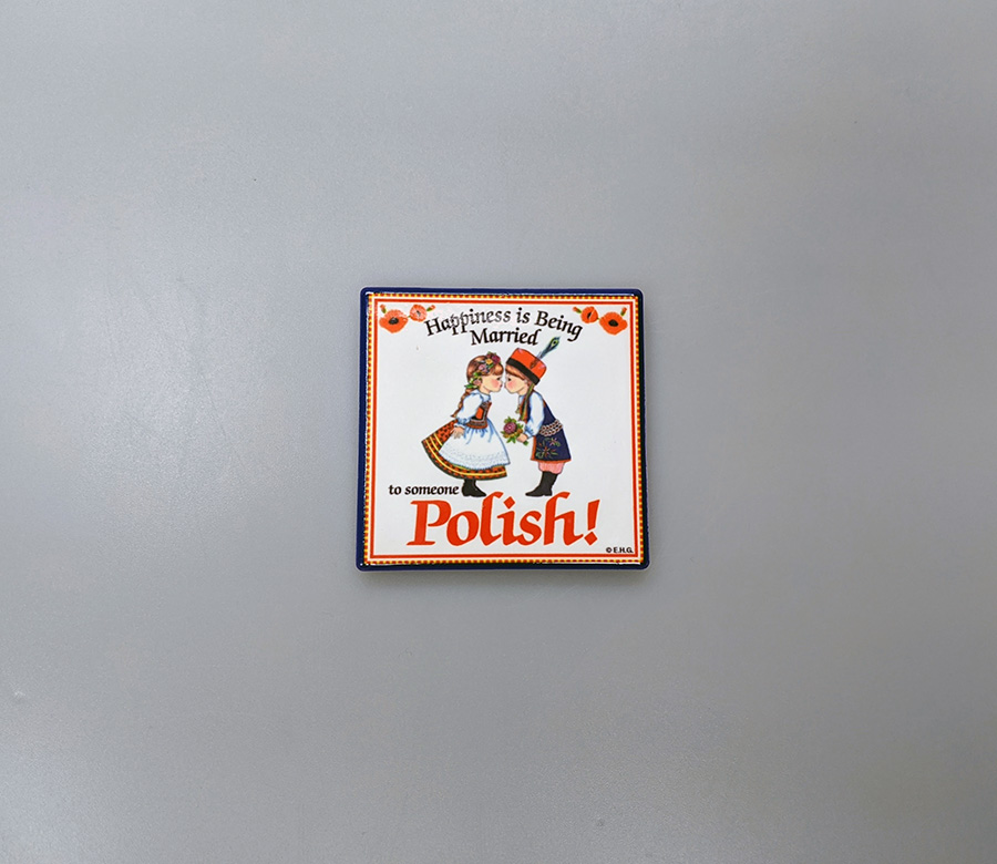Ceramic magnet with “Happiness Is Being Married to someone Polish!” design.
