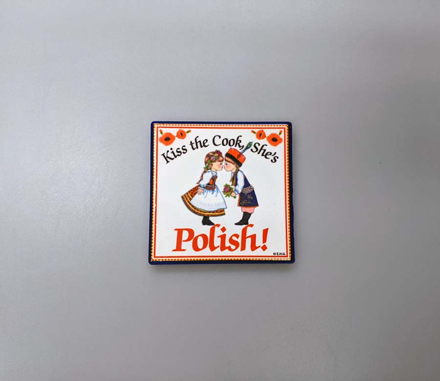 Ceramic magnet with “Kiss the Cook, She’s Polish” design.