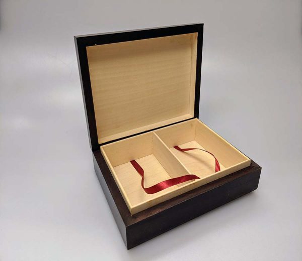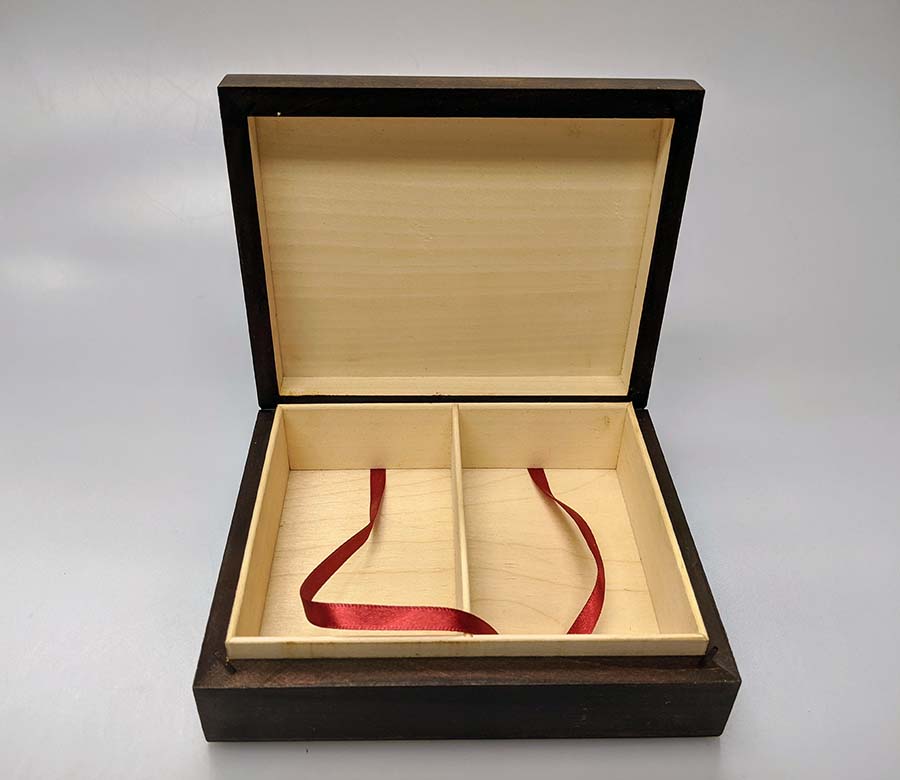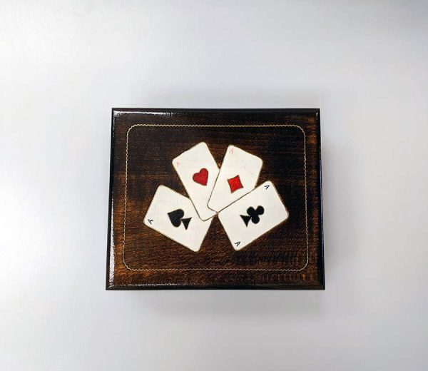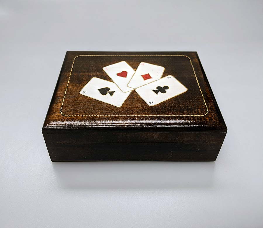 Dark wooden card box with a 4 Ace Cards design. Holds 2 decks of playing cards.