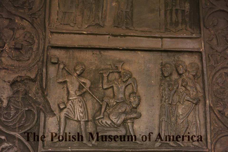 This Bishop from Prague(b.in 956) in Czechoslovakia was invited by Polish Prince Boleslaw Chrobry to preach and teach in the early Polish kingdom. Travelling on a mission of evangelization on the northern Baltic coast, St. Adalbert(pol. Swiety Wojciech) was captured by pagans and beheaded. Prince Boleslaw paid the equivalent of the bishop's remains weight in gold and buried him in Gniezno. This tomb became Poland's first pilgrimage site and soon the primary Polish Cathedral was built in its vicinity. In our times, every year in April a Gniezno Celebration(pol. Zjazd Gnieznienski) is held at this very location. St. Adalbert-Swiety Wojciech was declared Poland's Patron together with St. Stanislaus, another Bishop and Martyr.