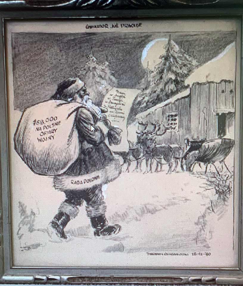 Photos display PMA Library collection book Sekrety Swietego Mikolaja (eng. Secrets of St. Nicholas) by Jean-Louis Hue, Ossolineum, 1991; Swiateczne Zwyczaje by Fr. Jan Jaworski, London, 1962; Jan Krawiec Collection cartoon depicting St. Nicholas with a gift sack on his back reading "58 thousand dollars for Polish war victims" and a list in his hand reading: "Ours(refugees) in England, Turkey, Switzerland, Portugal and occupied territory", with a signature "Polonia Council" on his coat rim, Dziennik Zwiazkowy, Feb. 16, 1940.