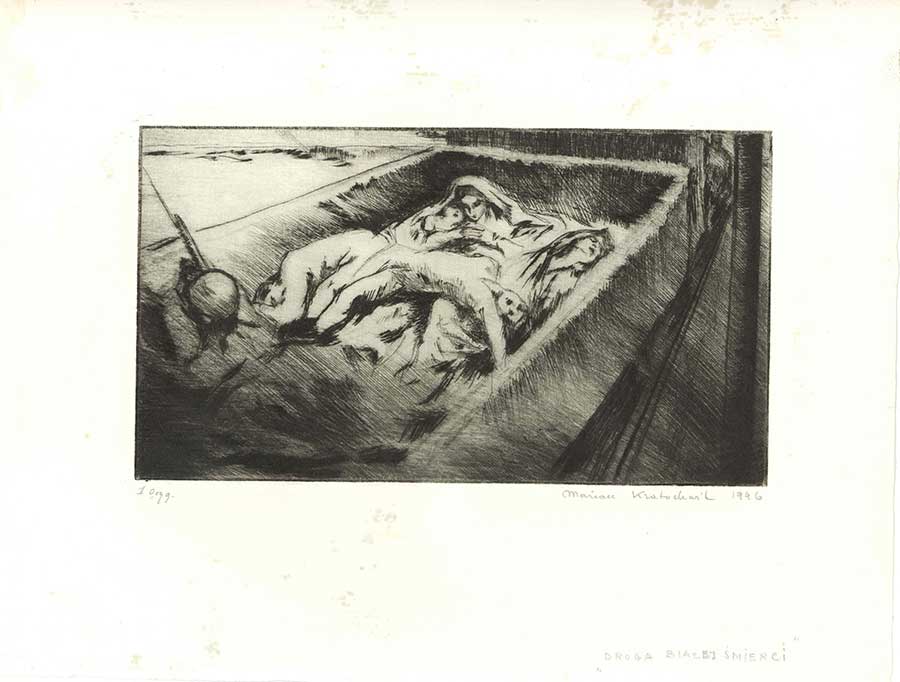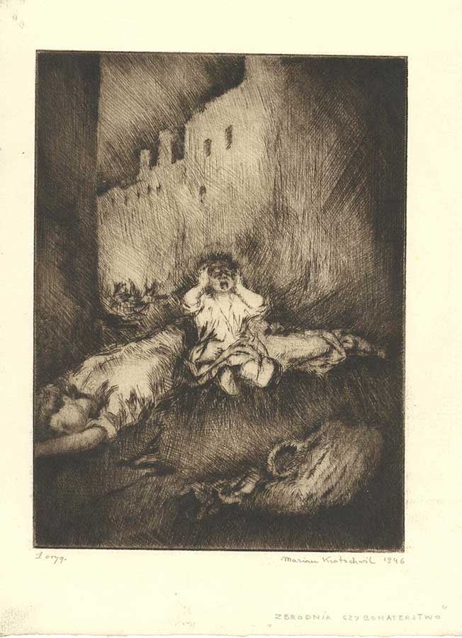 A graduate of the Fine Arts Academy of Krakow, Batowski studied in Munich, Vienna, Paris and Rome. Upon returning back to his beloved Lwow, Stanislaw Batowski taught painting and drawing at his own Independent Academy of Art (pol. Wolna Akademia Sztuki). One of his students was Marian Kratochwil, Polish painter (b. 1906-d. 1997). Stanislaw Batowski greatly admired Polish epic literary giants Juliusz Slowacki and esp. Henryk Sienkiewicz whose Trilogy was enhanced by his illustrations. He strongly identified with Poland's historic artist and chronicler, Jan Matejko. Batowski's greatest masterpiece storytelling of Poland's defining moments speaks volumes through such paintings as The Charge at Rokitna (1915), The Attack of the Hussars at Katyn (1917), Entrance of Jozef Piłsudski into Kielce, (1935), Scene from the 1920 war (1920's), Polish Thermopylae-Battle of Zadworze (1929) and many other works. Pulaski at Savannah, (1933) is Batowski's standard work hailing the renowned hero of Poland and America, Polish Count and General Casimir Pulaski. This monumental painting is on display for you at the PMA! It carries its weight in historical gold, especially right here, locally in Chicago! Donated to the Museum on Oct. 9, 1939, at the occasion of the opening of our Great Hall of Exhibits, during the Second Conference of the Historical-Museum Society by the Polish Women's Alliance of America, the Pulaski at Savannah masterpiece had earlier amazed audiences at the Chicago Century of Progress 1933 Fair. Ever since Eleanor Roosevelt unveiled the painting at the Art Institute in 1934, and the PWAA purchased it, Casimir Pulaski found a loyal home at the PMA, and has attracted a global audience. General Pulaski is regarded as "the Father of American cavalry". Stanislaw Batowski also specialized in everyday scenes like Summer Day (1918), Uhlan with horses (1923), Arrival of an Unexpected Guest (1934). He left posterity frescoes of unprecedented beauty which decorate the Grand Theater in Lwow. Stanislaw Batowski's talented protege Marian Kratochwil is well represented at the PMA. This Polish artist, born in Huculszczyzna (today's Ukraine) escaped from Poland in 1939 and settled in Great Britain and Scotland. He specialized in city landscapes. Kratochwil also borrowed from Batowski's realism esp. in his series of etchings and drawings on the themes of WWII victims in his native Poland and what suffering Poles were forced to endure at the hands of German and Soviet perpetrators. The PMA is the proud owner of an assembly of 25 WWII graphics made by Marian Kratochwil in 1941, 1943 and 1946 during his stay in Scotland. Please visit us - we are open!