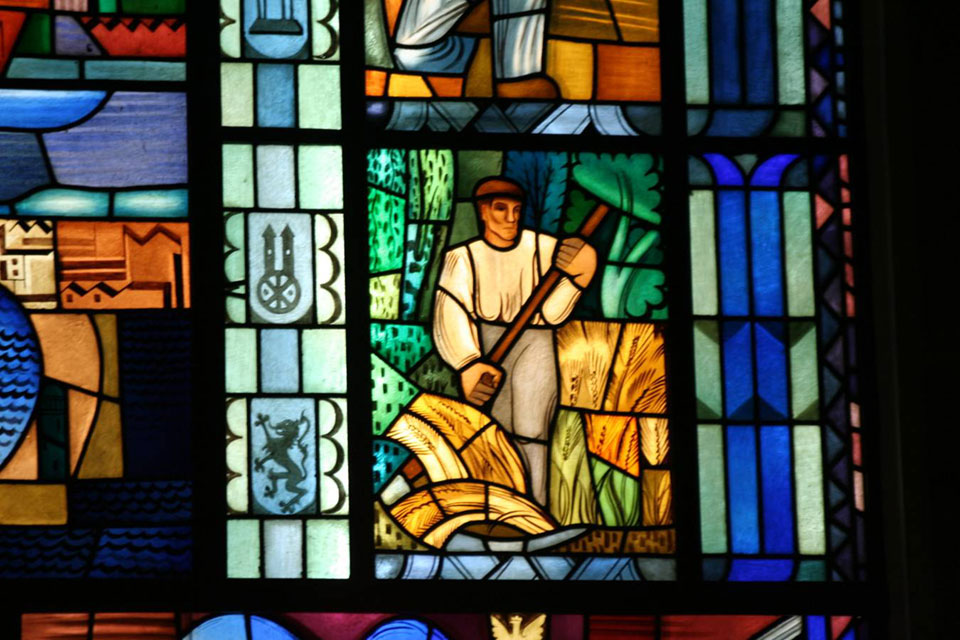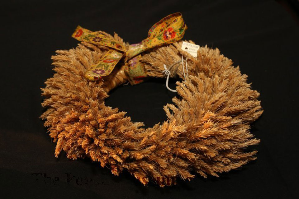Photos include PMA Painting collection's Zboze-Wola Radziszewska by Stanislaw Kamocki, 1938, oil; Poland Reborn detail by Mieczyslaw Jurgielewicz, 1939, stain glass; Landscape by Leon Dolzycki, pre-1939, oil; Cabbage harvest by Jarocki, 1939, oil on canvas; Composition by Ignacy Pienkowski, pre-1939, oil on canvas; harvest wreath reliquary decorated with ribbon, pre-1939.