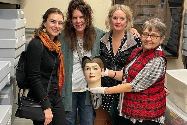 Visitors from Chicago Dramatists Klaudia Siczek, Carson Becker, and Ruth Margraff looking at the PMA Helena Modjeska collection with Basia Kożuchowska. They are interested in a potential theatrical collaboration based on the Polish-American Shakespearean actress.