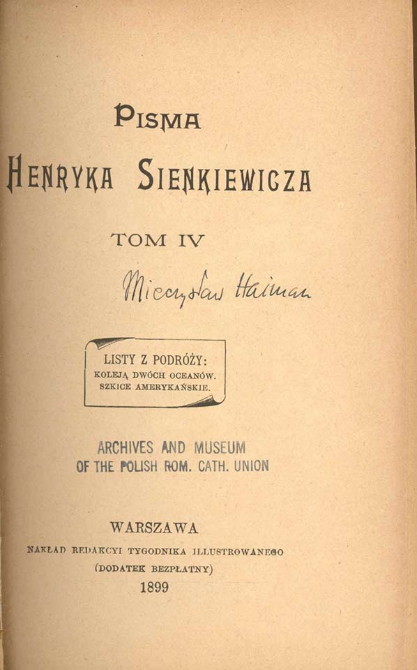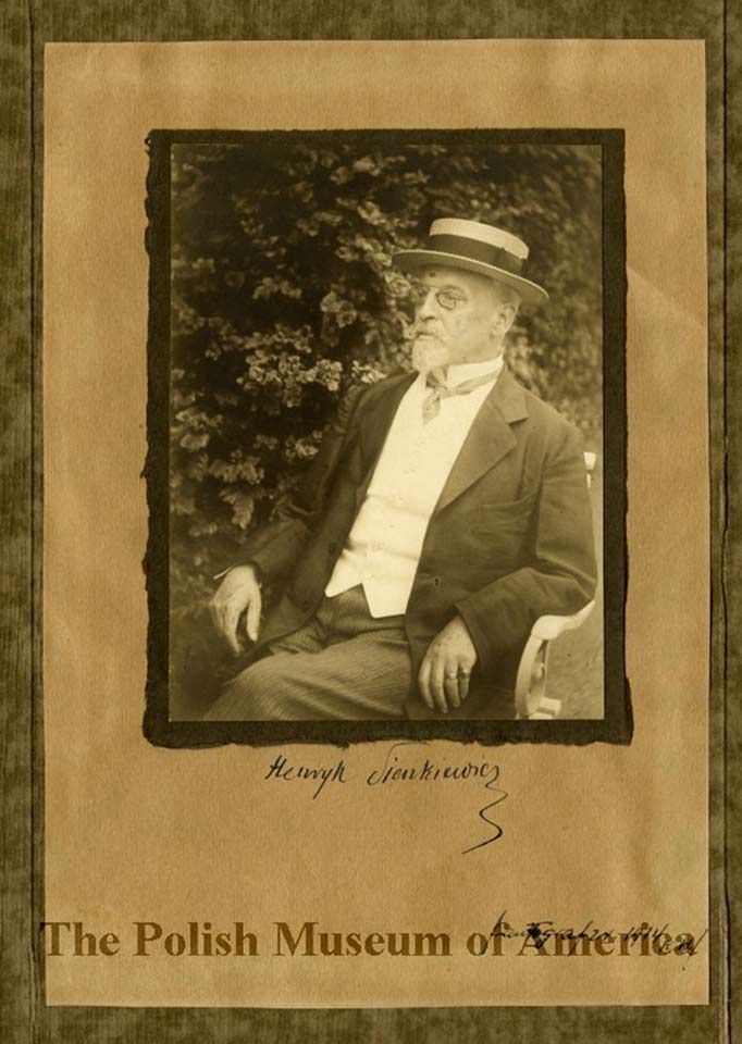 Photos depict Henryk Sienkiewicz writings from 1899 with an autograph by PMA initiator and first Director Mieczyslaw Haiman; PMA photo collection's picture of Henryk Sienkiewicz from 1914.