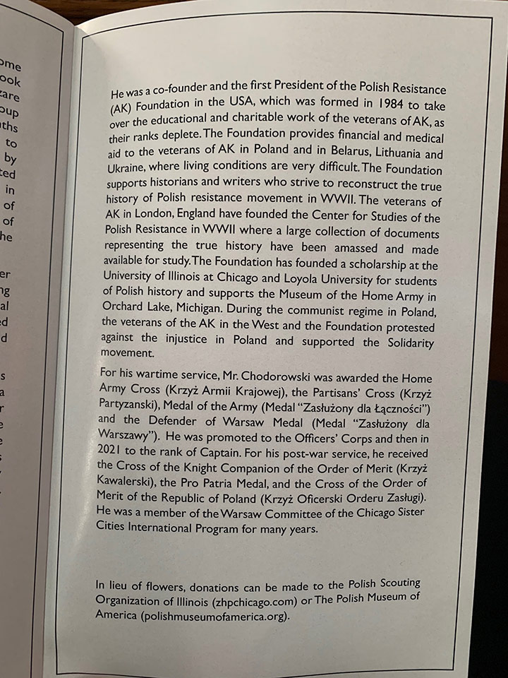 Active within Polonia, with a special dedication to veterans of the Polish Armed Forces, he cofounded in 1984 and served as the first president of the Polish Resistance (AK) Foundation in the USA. Highly decorated, Chodorowski was awarded, among other medals, the Home Army Cross, Defender of Warsaw Medal, and the Cross of the Order of Merit of the Republic of Poland.