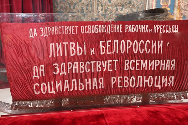 The custom of war trophies collected by victors can be traced to ancient Greece and Rome. PMA collections include two such trophies from the War of 1920. The first item is a Soviet propaganda banner captured during the war. It was acquired through a donation from Lieutenant Jan Kostrubala, a graduate of Weber High School in Chicago, and a volunteer for the Polish Army in France. Despite his good Catholic upbringing, he lied about his age when he enlisted and was sent to the third officer training course in Toronto, then Camp Borden, and finally, Niagara-on-the-Lake, Ontario. Arriving in France in early 1918, he was posted to the 3rd Regiment of Riflemen. In Poland, that regiment was reorganized as the 45th Kresowy Rifles Regiment. Kostrubala engaged in many battles against the Bolsheviks, earning the Polish Cross of Valor, or Krzyż Walecznych. He was one of the last Americans to be demobilized, returning to the United States in January 1921. The Bolshevik political banner reads Greetings from the 3rd Communist International (Congress). On the reverse, it states Greetings to liberated Lithuania and Belarus! Welcome to the International Social Revolution!