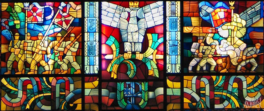 Our large stained glass window from the Polish Pavilion at the 1939 New York World’s Fair hints at this battle at the very bottom, where the initials JP for Józef Piłsudski, his Marshal’s baton, and the Virtuti Military Cross are enclosed in a laurel wreath, the prize for victory in 1920.