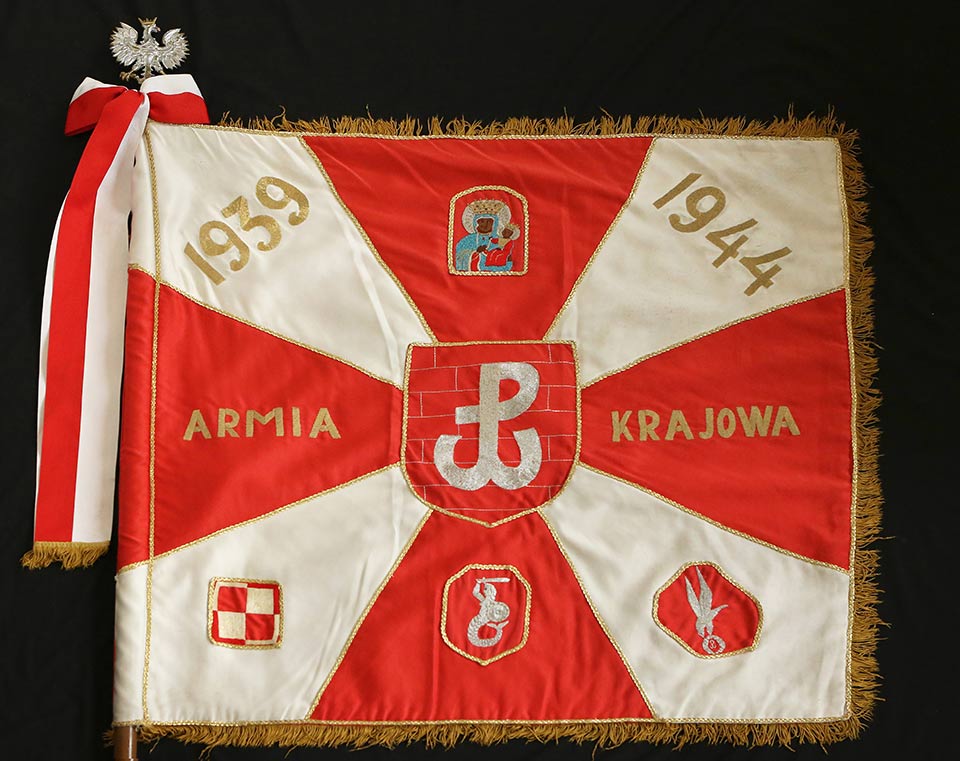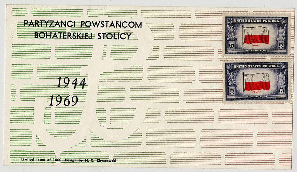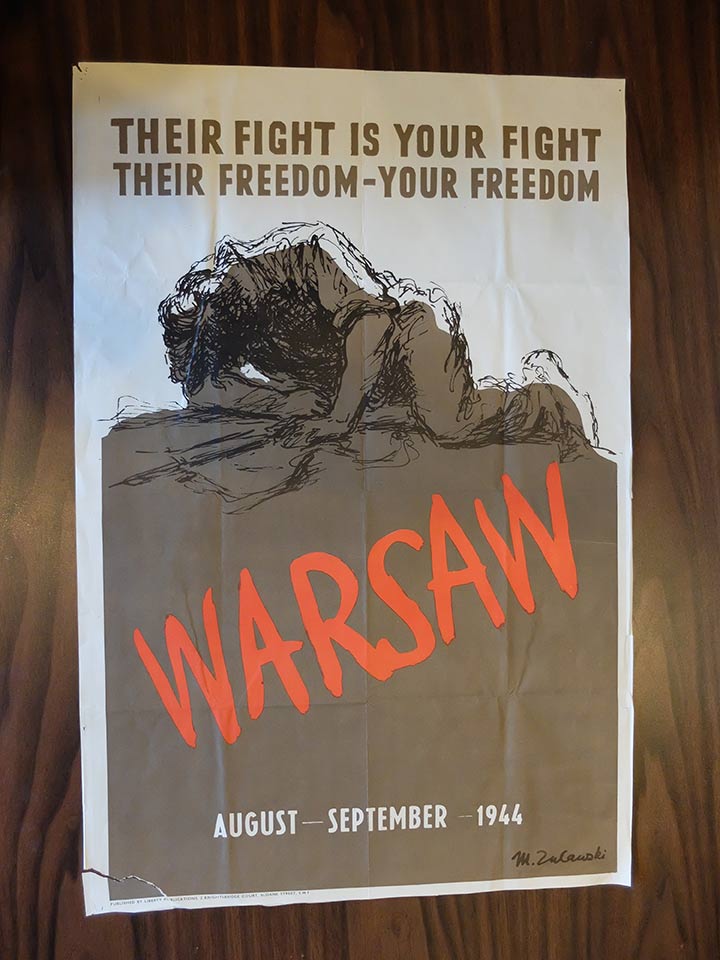 Photos show PMA oil painting Bouquet in a vase by Irena Pokrzywnicka,1939, PMA Stag bronze bass relief sculpture by Jozef Klukowski,1938, PMA Poster collection on the Warsaw Uprising theme, a Chicago Home Army chapter standard, actual scenes from fighting Warsaw in PMA Warsaw Uprising photo exhibits and US Postage saluting the Warsaw heroes.