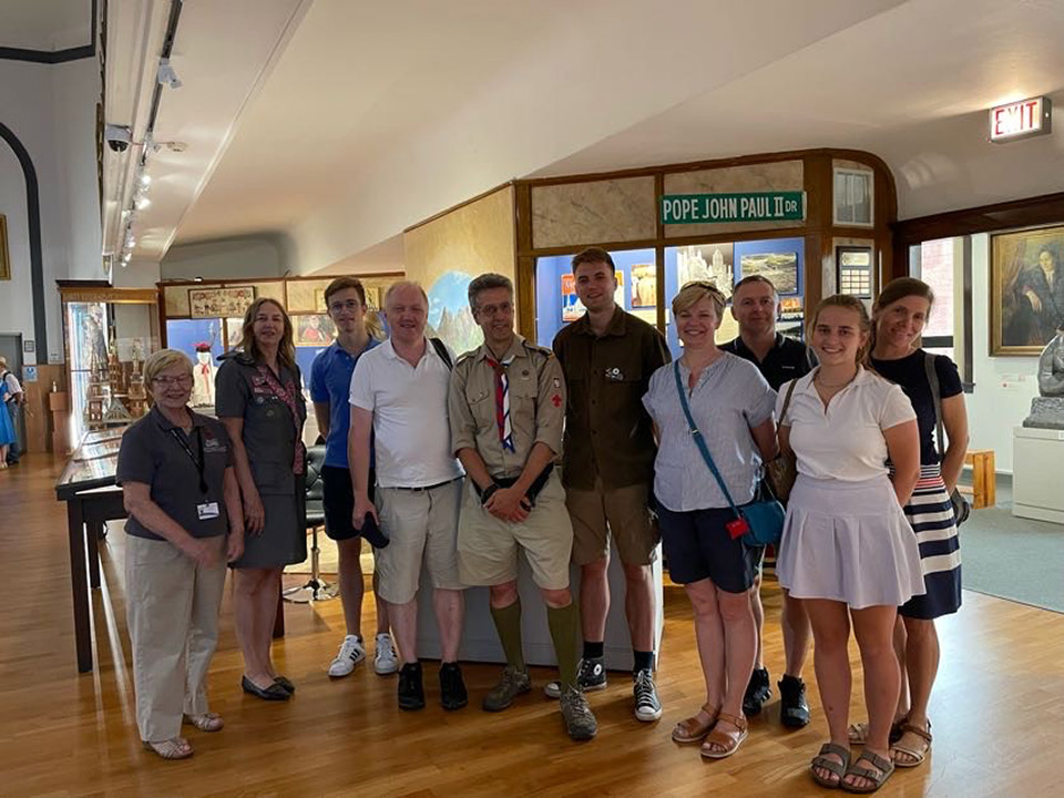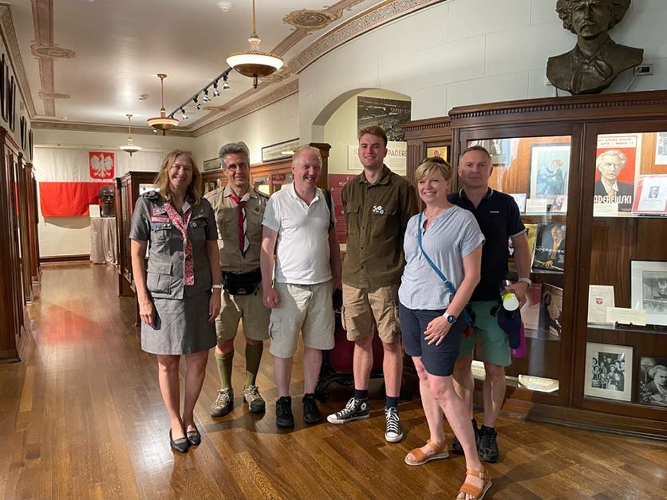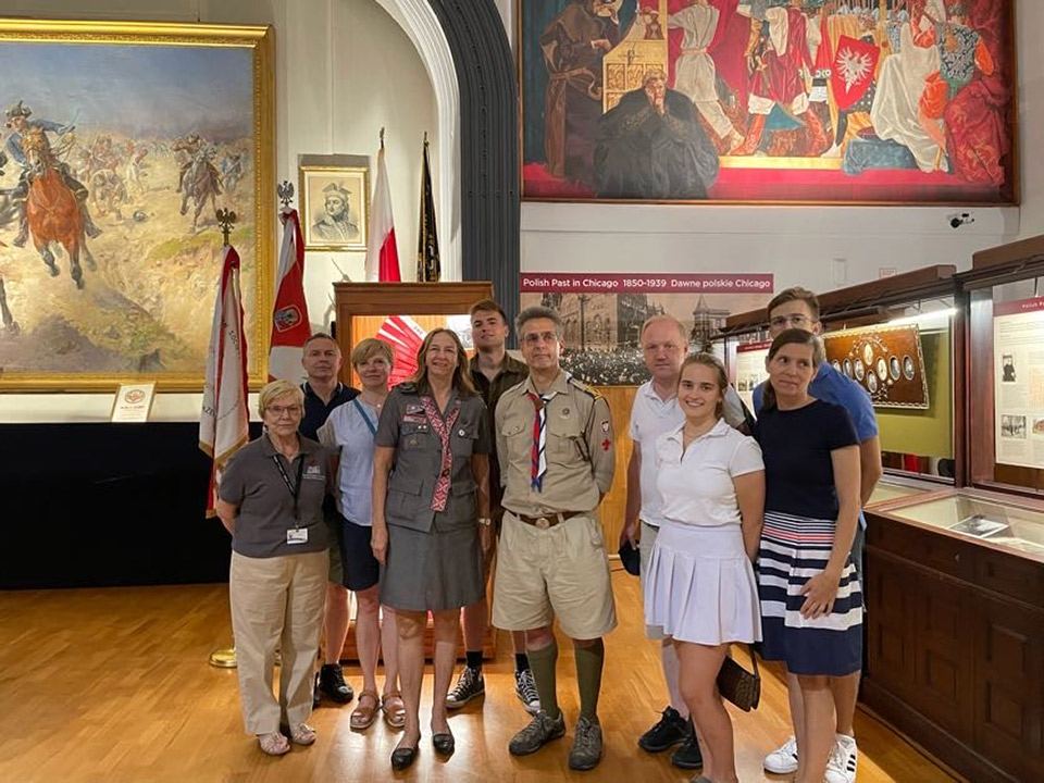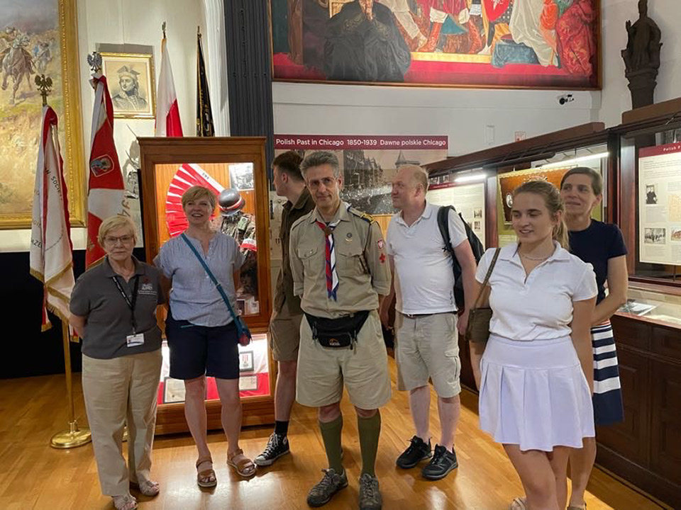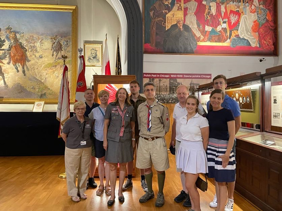 Today marked a special occasion at the Polish Museum of America as we had the honor of hosting esteemed members from the Scouting Association of the Republic (ZHR), Foreign Department. Among our distinguished guests were Scoutmaster Franek Pepliński, a prominent figure within the London scouting community, and Scoutmaster Aneta Macheta, also hailing from London. Joining them was Scoutmaster Beata Chodorowska-Niebrugge, an esteemed leader who presides over the Chicago branch, alongside the dedicated Sub-scoutmaster Mateusz Świerzyński. Notably, our very own Lusia Bucki was also in attendance, enhancing the significance of this gathering. Guiding our visitors were two of our finest: Head Archivist, Halina Misterka, and our Tour Guide, Barbara Kozuchowska. Highlights included touring the Great Hall, showcasing a rich array of military uniforms, sculptures, and notable paintings such as Batowski's "Pulaski at Savannah"; the Jan Ignacy Paderewski Room, dedicated to the celebrated maestro and adorned with his cherished mementos; and the Transportation and Maritime rooms, offering insights into vital aspects of our history. We extend our gratitude for their visit and eagerly anticipate their return!