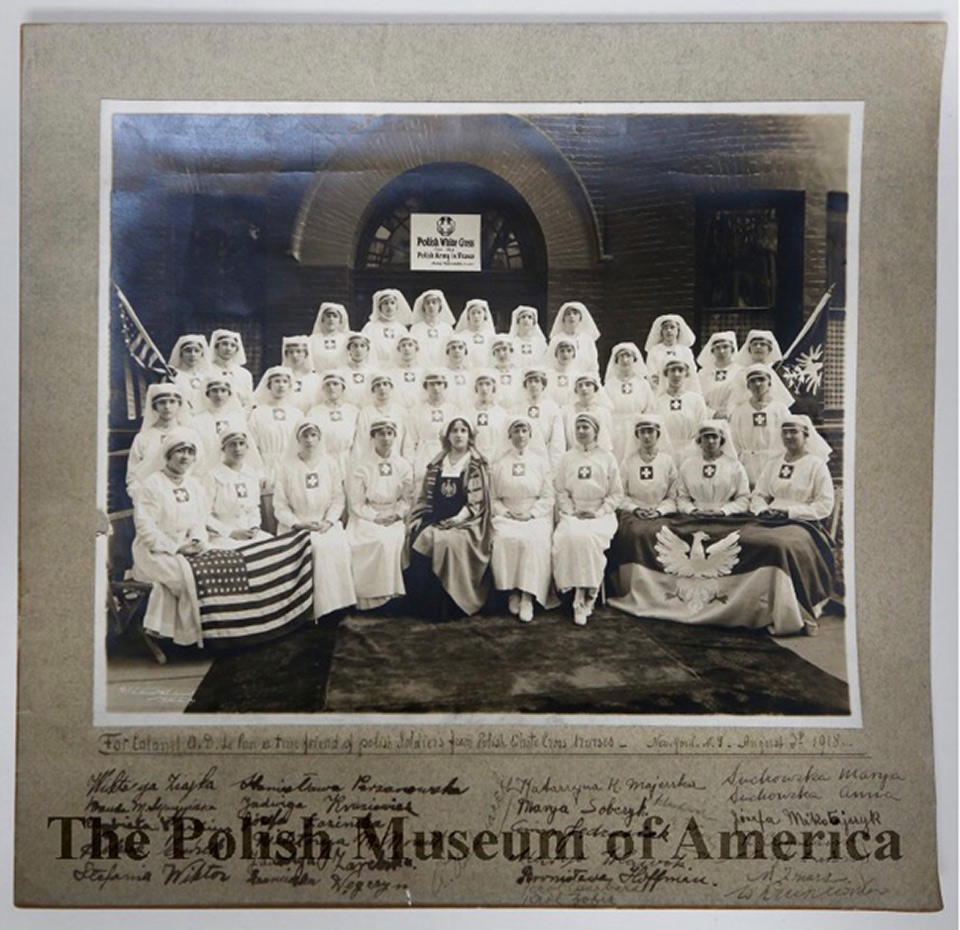 Photograph from the PMA Photo Collection: Polish White Cross Nurses with Helena Paderewska, 1918. Autographed by the nurses and dedicated to Colonel Le Pan.