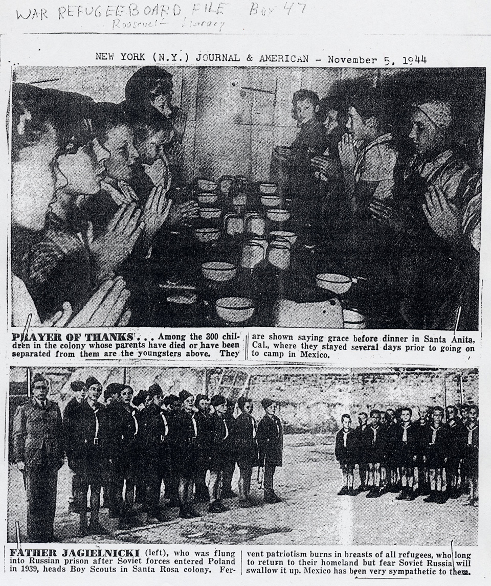 Photos show PMA Documentation re Chicago based Polish refugees marking 50 anniversary of their Santa Rosa-Mexico safe haven and related Chicago Sun-Times article; WWII Refugee Board records re U.S. participation in 1942 WWII Polish refugee project in Mexico; PMA Painting collection's "Polish Refugees"(series) by Alicja Edwards, oil on canvas; PMA Poster collection's "Polish War Relief: Poland's Refugees" by Wladyslaw T. Benda, 1944.