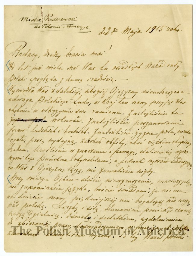Przemowienie – "Mistrz Paderewski do Polonii w Ameryce", wygloszone 22 maja 1915 roku w Humboldt Park, Chicago