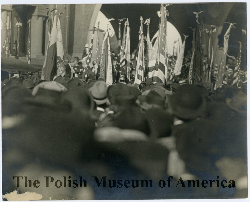 Black and white photograph depicting Memorial Day celebration with participation of Ignacy Jan Paderewski; he is visible in the middle left, between the crowd on the first plane and the architectural background of the Boat House.