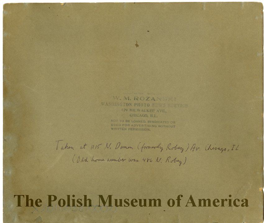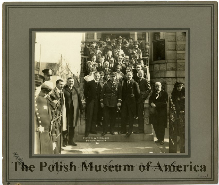 Photograph depicting a group of people with Gen. Jozef Haller, all posing on the steps of the Polish Consulate at 1115 N. Damen Ave (formerly 486 N. Robey), Chicago, IL, Nov. 8, 1923. The consul at the time MAY have been Albert Rybarczyk (wife Cela). This information comes from the 1928–29 Polk Directory in the PMA library.